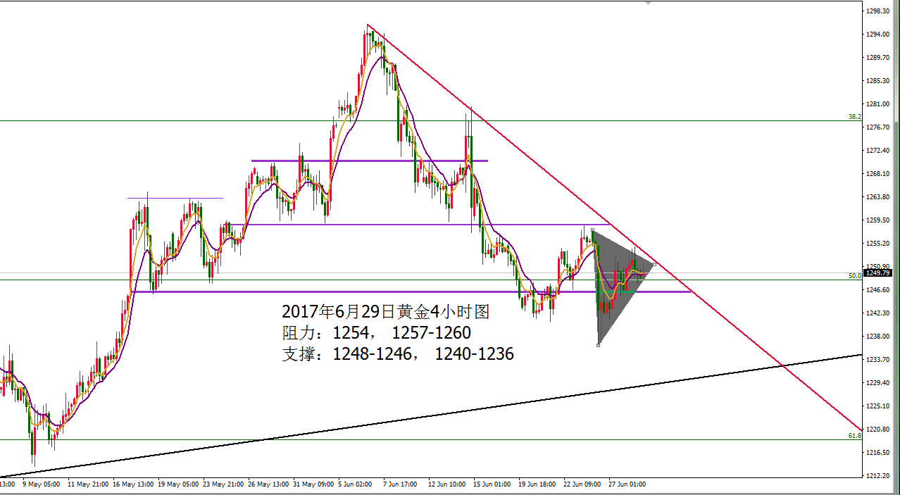 Anna点解:6月29日原油白银多头明显,黄金仍处多空交战 周三黄金开盘延续凌晨美联储主席耶伦的鸽派言论,依托1246走反弹,欧盘时段最高触及1255附近,美盘未做延续,围绕1250震荡调整收盘。 亚盘反弹,欧盘延续并创高点,美盘震荡。 昨日因欧洲央行行长德拉基对于欧洲央行的债券收益率上涨作出回应和发表看法,黄金日内震荡