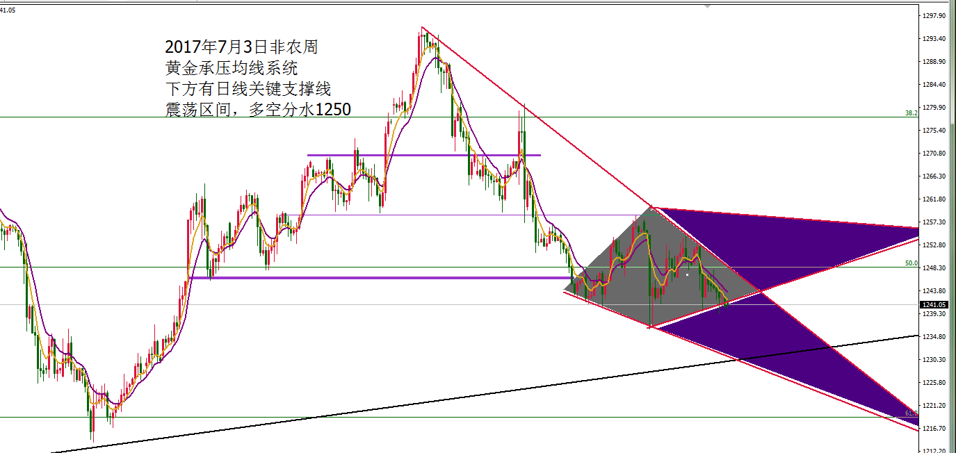 Anna点解:7月3日黄金破1240探1227,原油强势难挡 上周五,黄金亚盘冲高1248,欧盘回落并破位日内低点,美盘前反弹1244-1245继续下探1239,最终震荡收线1245下方。 上周因胖手指,黄金暴跌20美元,将原本强势的行情拉回弱势,多次测试阻力线未果,最终承压回落,月线收阴,周线十字星后收阴料将加速。 周线连续两周在MA120