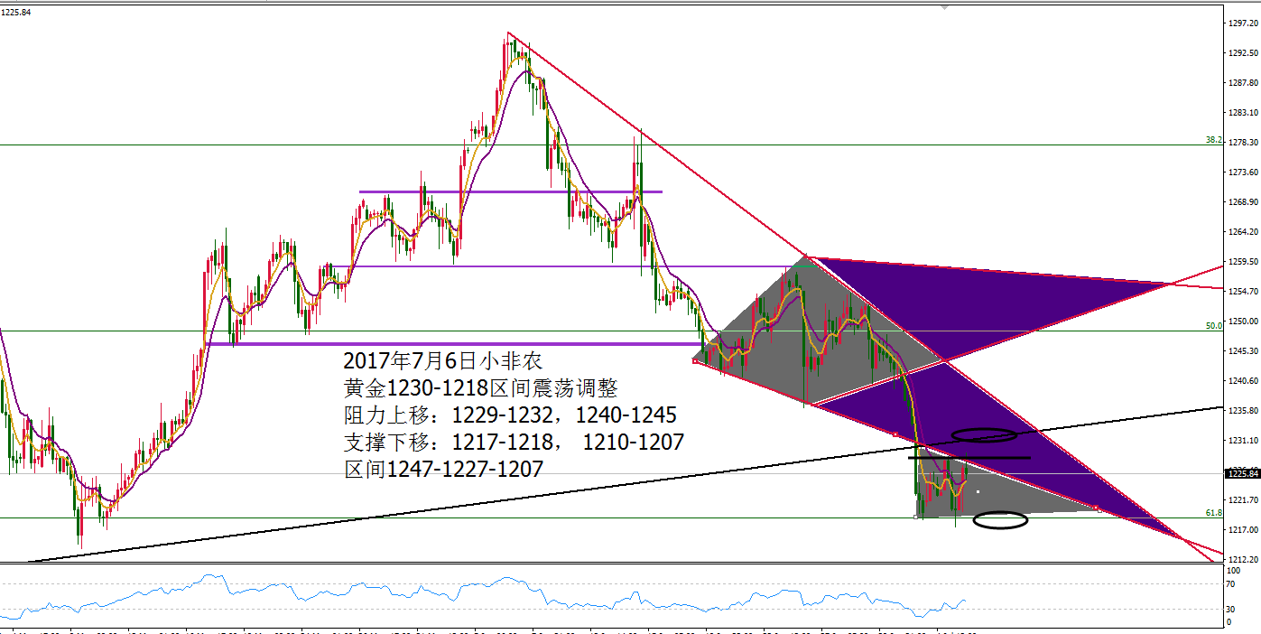 Anna点解:7月7日黄金无畏非农仍是空,旗型or对折三角切换 周四亚盘黄金冲高受阻1229,午后开始走回落,欧盘延续跌势并破位日内支撑线,美盘小非农利多未能突破高点,震荡走跌。 亚盘反弹,欧盘回落并破位日内低点,美盘震荡走低。 早间7点前后,市场再现4.6亿美元黄金空单进场,黄金自1226跌至1219,白银16.2闪跌至14.3,