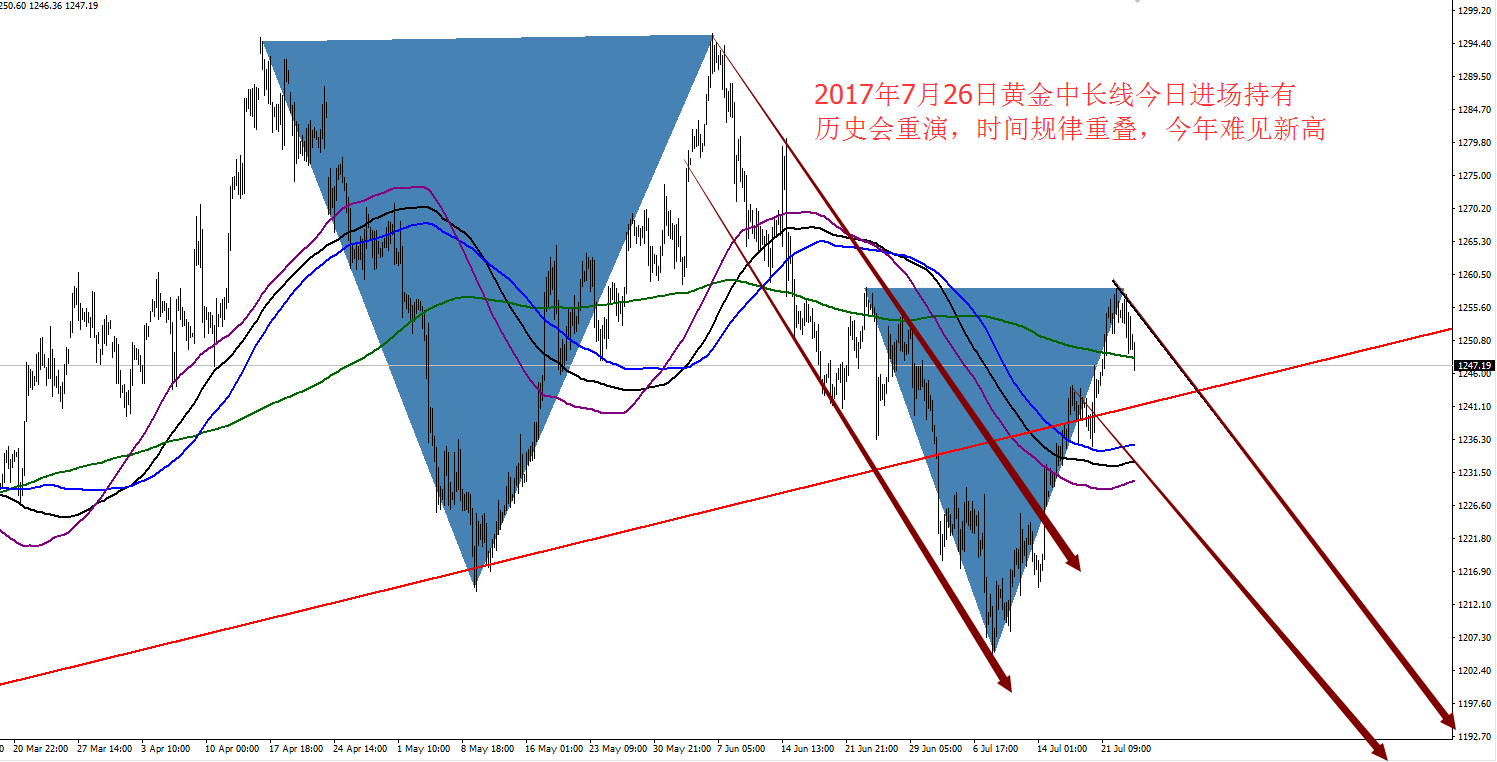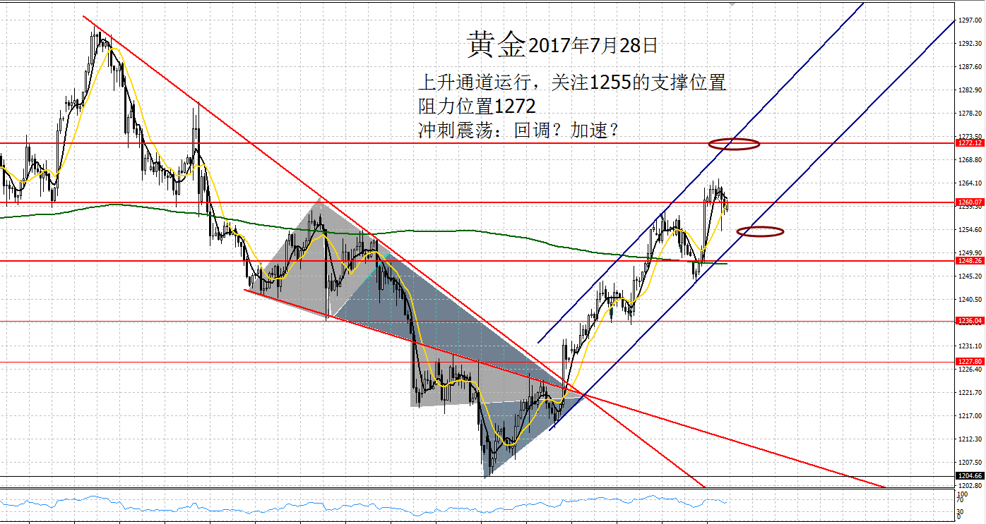 Anna点解:7月26日黄金防守1258中长线,原油强势看EIA 周二黄金开盘1253附近,亚盘震荡走高,午后到达日内高点1257.46,走高并未得到延续,反而是高位震荡调整,欧盘时段开始走回落,并且打破本周强支撑1252,触及低位1249反弹,美盘诱多拉升再次测试1254,最终仍是承压回落,震荡走低。 亚盘冲高受阻,欧盘回落破支撑,美