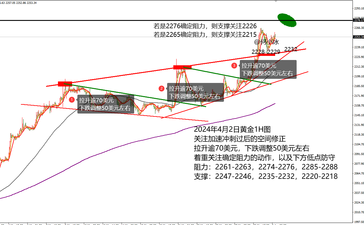 何小冰:黄金顺势低多连胜,2250分界切换区间 黄金昨日周一,早盘开盘直接拉升突破历史新高,最高加速冲刺触及2265-2266区域,然后就开始围绕2260上下5美元的区间进行持续的横盘震荡 美盘时段短线回踩2243又确定支撑冲刺2257-58,快速承压下跌跌至2228-2229区域后又确定支撑开始反弹上涨,直至今日周二早盘价格延续攀升寻找到2255-2256区域 午间二次回踩确定支撑后冲刺2260范围 深蹲确定支撑,然后重新探底回升上来 那么,对于今日的黄金来说,守低破高是关键, 能够保持这个节奏,还将诞生新高,而临时性的高点我们昨天通过推算,计算出了2276区域 对于接下来的黄金,我们归纳