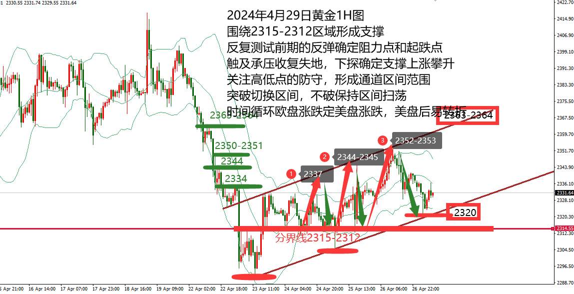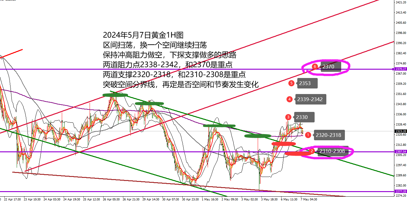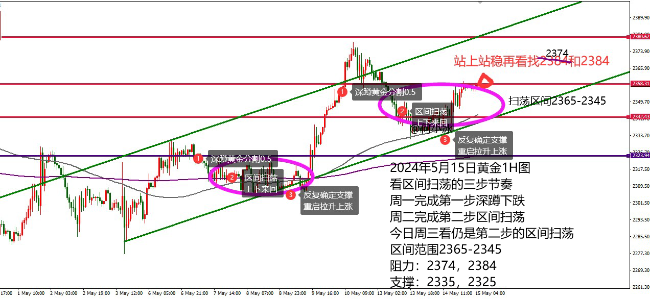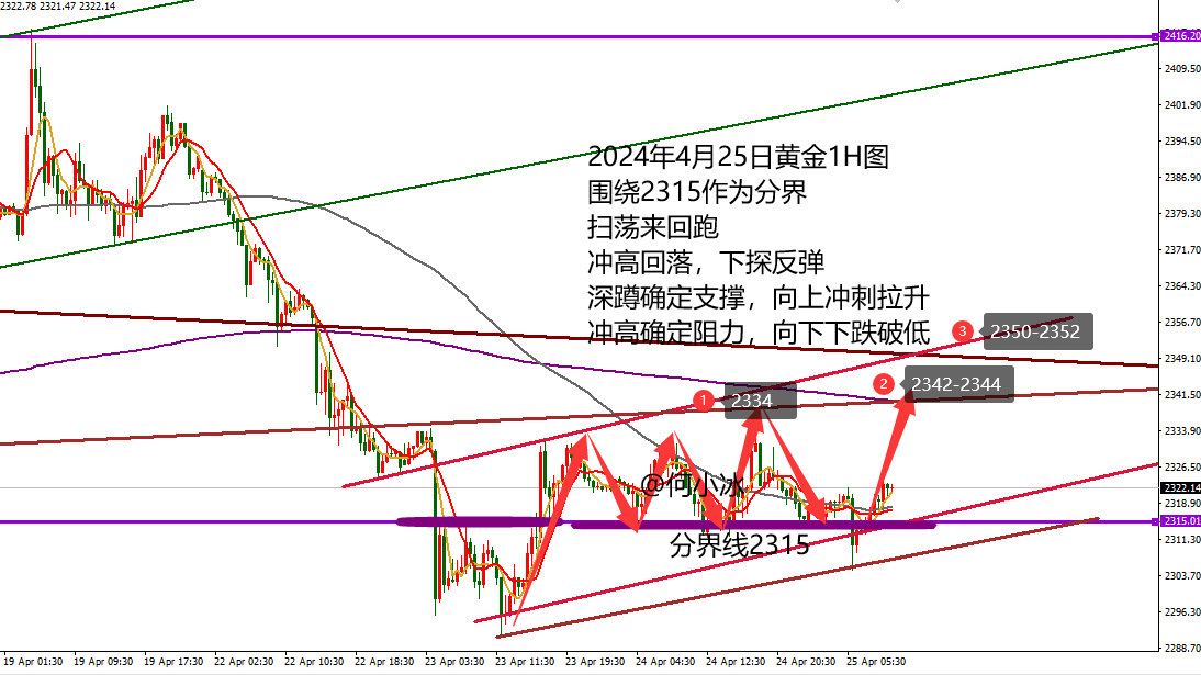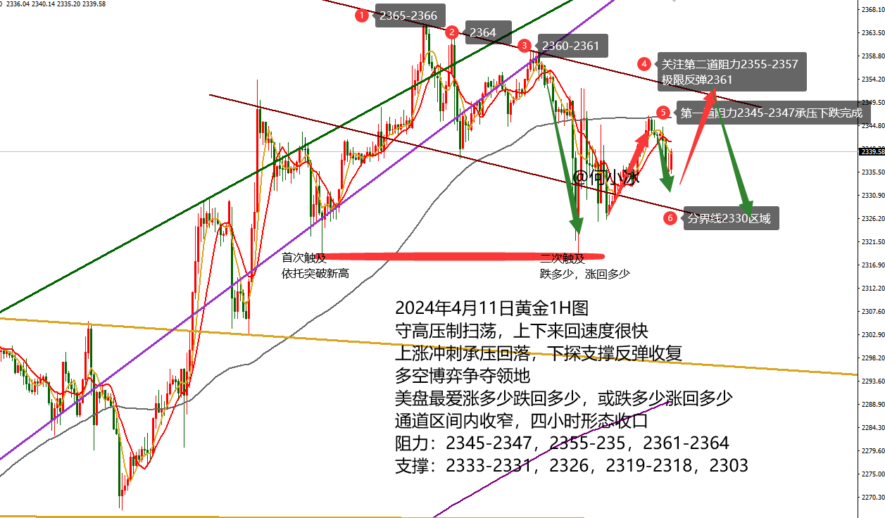 何小冰:黄金到达2319反弹,守低还是2330-2360扫荡 疯狂星期三,昨晚的黄金不能用一般疯狂来形容,只能用疯癫癫来形容了 四月份连续七个交易日突破历史新高,昨日第八周交易日再度确定2360关口的阻力后开启了扫荡模式,是疯狂扫荡,当然也有外力的助推,让整体行情上下来回的跑 至于多少个回合,十个手指头算不完,得加上脚指头! 美盘过后上演跌多少涨回多少戏码,从2352加速下跌到2319,又重新找回2352,还有反转,确定阻力点又再度承压回落,往下找寻2326区域,凌晨最后确定阻力点2345,价格仍是处于通道区间内 那么,对于今日周四来说,着重关注的还是区间扫荡,而空间上需要逐次进行切换 其一