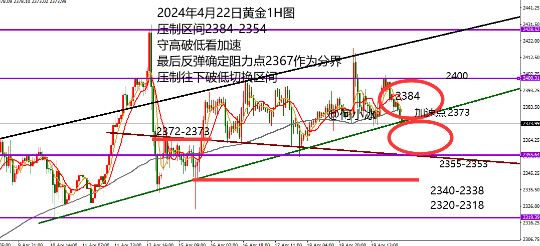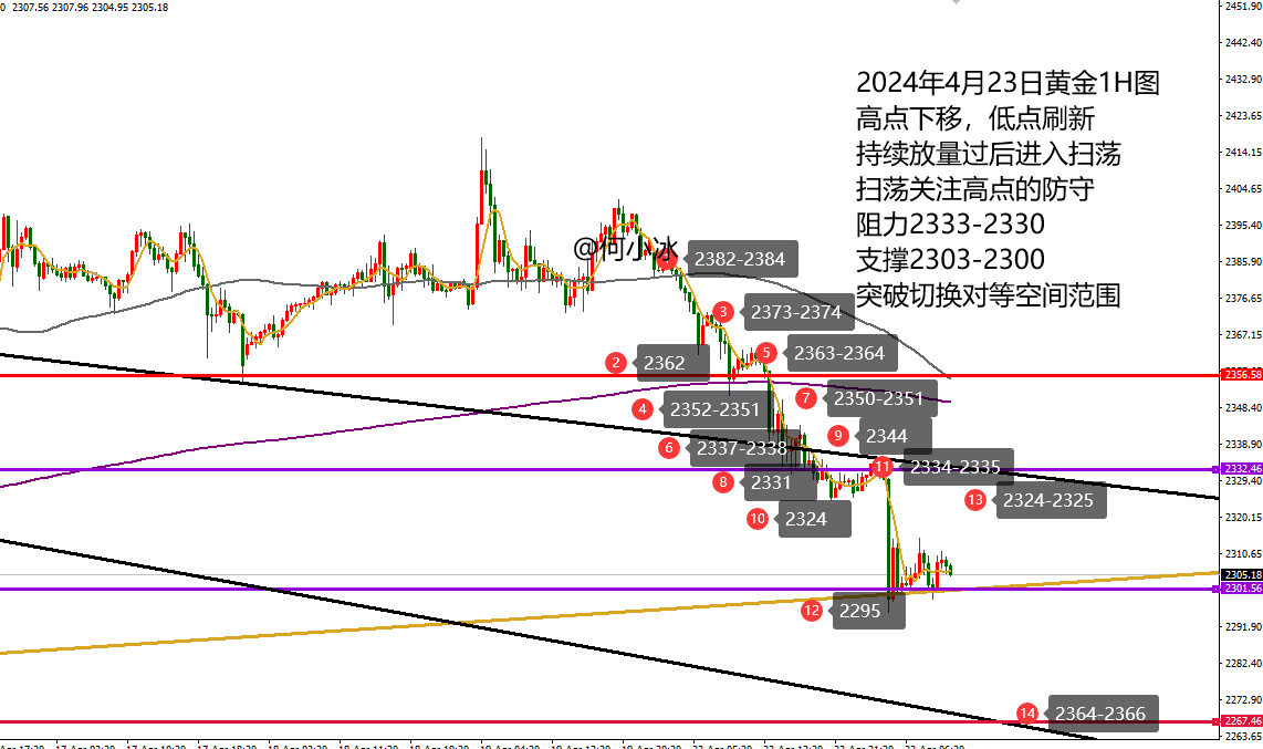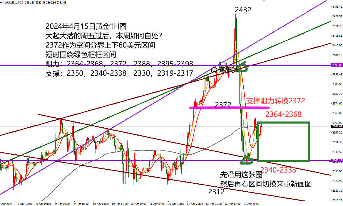 何小冰:黄金两次高空先收,2366-2336区间扫荡 疯狂的三月黄金,疯癫的四月黄金, 三月上半旬黄金累计上涨将近100美元, 初步开启上涨模式, 四月上半旬的黄金加速冲刺累计上涨超200美元 ,同时也创下 最近一个半月的最大单日跌幅 上周五,黄金加速冲刺2400关口,这不是结束,最后的结束在于美盘时段,加速冲刺2431后,好啦!冲刺放量完成,扭头急转直下,没有最低只有更低,一路下跌,一直到2334-2333区域,跌幅将近100美元 将整一个行情节奏稍微打乱了一下 因为在上周从周初到周尾都强调了一个大周期的时间循环, 注意两个变动时间点4月12日和五一期间 ,现在第一个时间变动点4月12日已