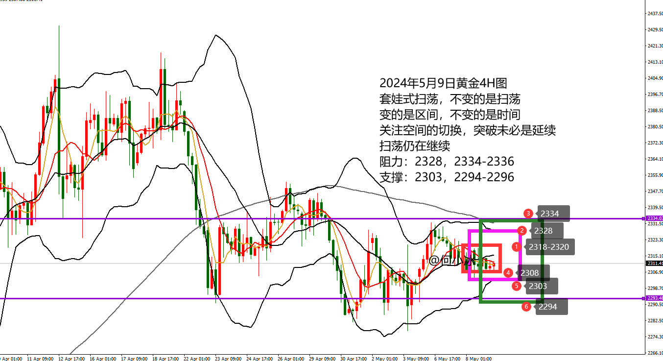 何小冰:黄金欧盘涨跌定美盘区间,套娃式扫荡 黄金目前还在2308-2320的区间内, 今日是重复昨日的扫荡?还是走不同的节奏或换一个区间还是扫荡? 接下来欧盘的节奏是关键 1、继续重复昨日的扫荡,亚盘依托2308冲刺2320,欧盘承压下跌低,继而找寻四小时下轨2303,以及更低的2296-2294区域 2、换一个区间继续扫荡,会突破2320的关口位置,向上拉升区间,找寻四小时上轨2328,幅度大点2334,确定阻力后继续承压下跌,换一个区间继续扫荡 再来回顾到前三天的走法: 黄金周一扫荡式上涨,周二扫荡式下跌,昨日周三直接摆烂,只剩下扫荡,一会涨,一会跌,来回的跑 不过时间循环相似点仍是保持