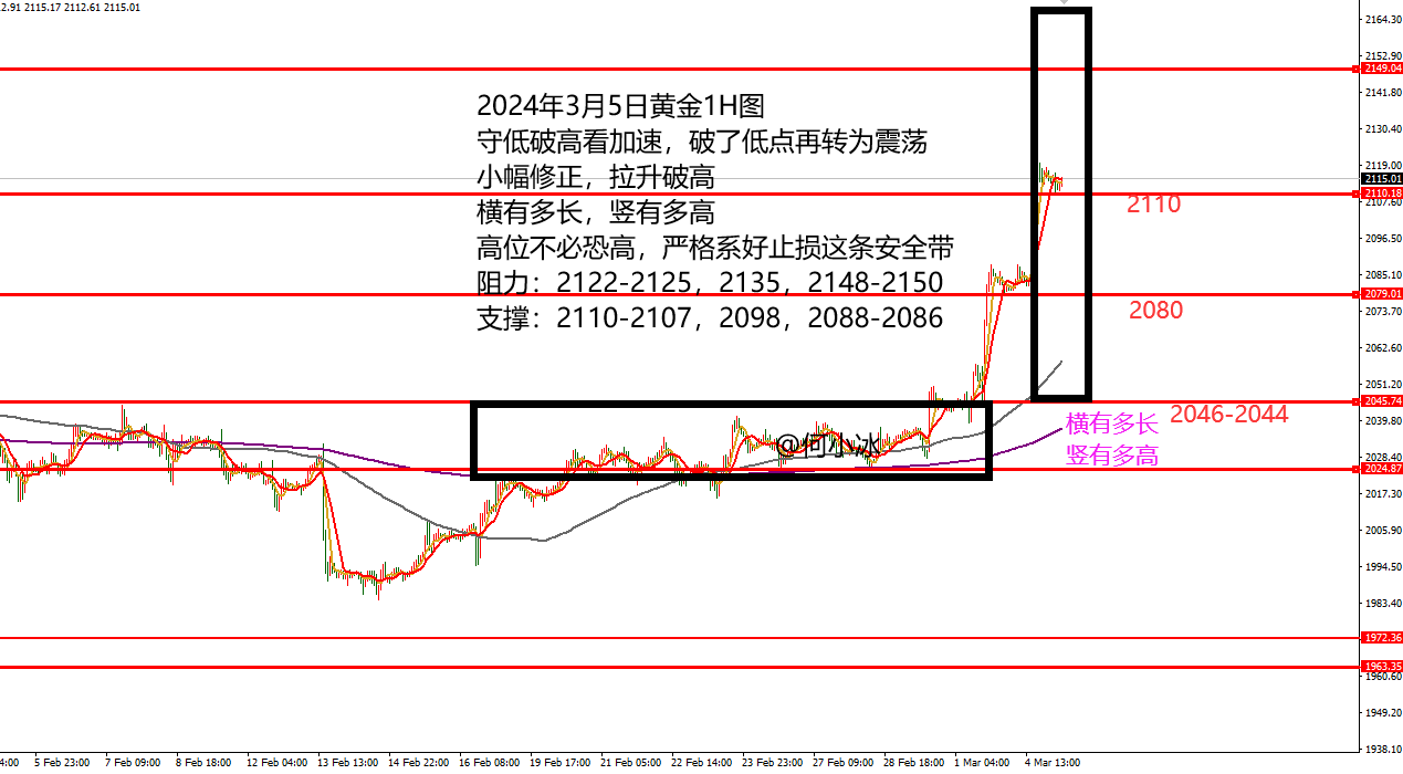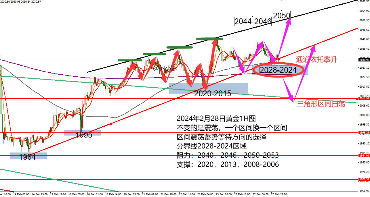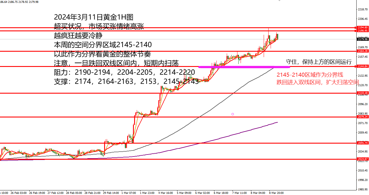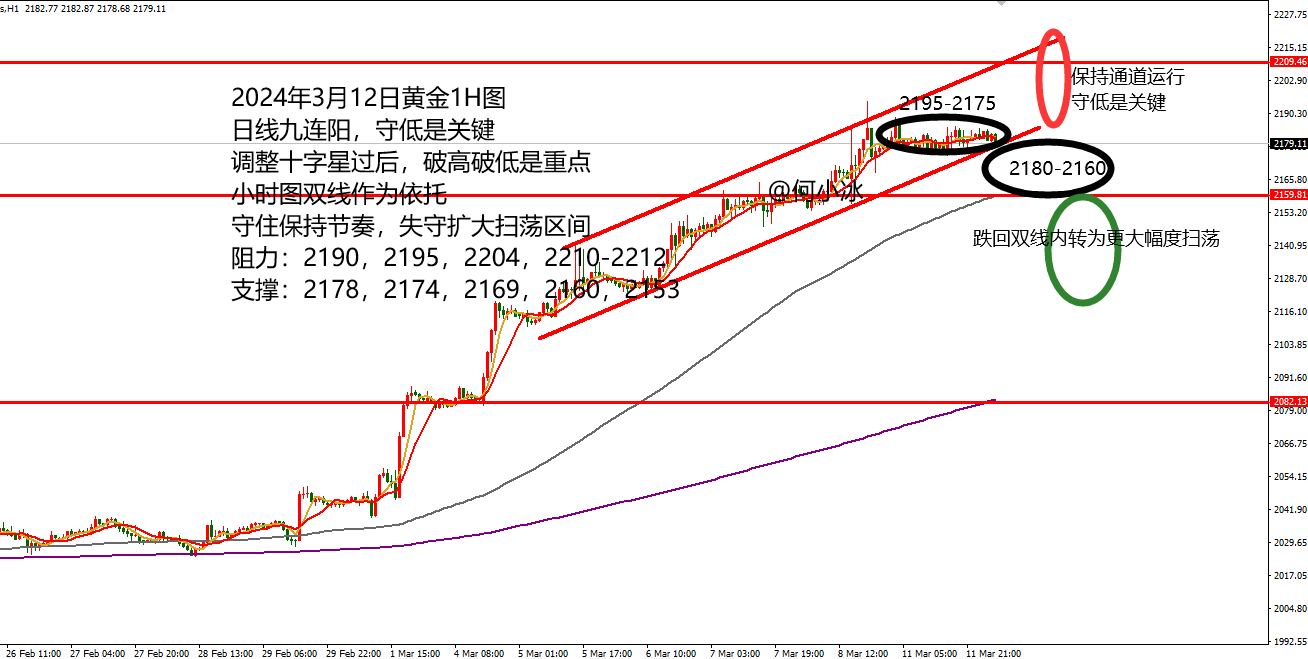 何小冰:黄金保持低多看涨,系好安全带不必恐高 黄金来到我们不熟悉的价格区域,上一次来到这个价格区域是在2023年12月4日,而且停留的时间很短,早盘开盘直接拉升突破历史高点,然后中午冲高回落全部跌回,所以对于这个区域的价格,我们是陌生的 但陌生并不影响我们继续保持低多的思路 主流节奏多头掌握主导权,上涨比下跌容易且空间幅度更大,那么便是坚持低多的思路,高位不要恐多, 心里默念老子带止损了,怕who? 回踩确定支撑便是进场多单,加速冲刺破高便是收获多单,然后再等新的机会,这一句我们已经说了两个星期了,嘴皮子都要说破皮 黄金在上周后半周比较明显的节奏,便是修正十来美元,拉升二三四十美元,3月份的