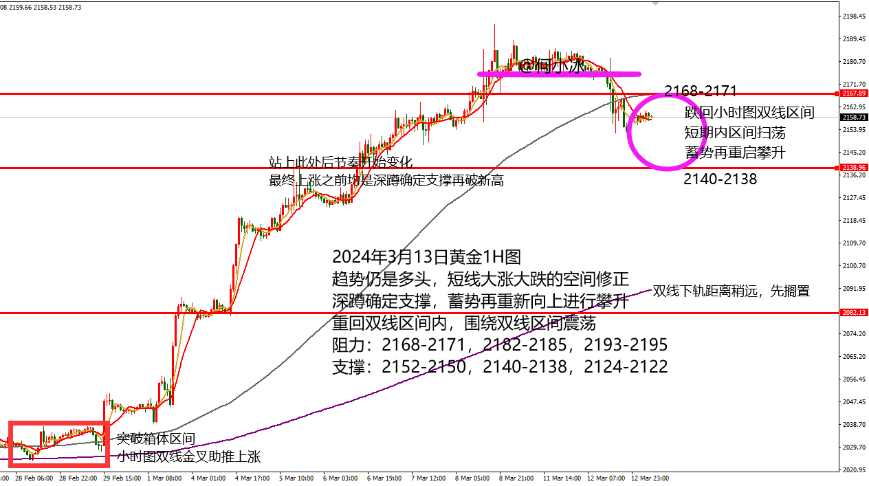 何小冰:黄金不破2168直接空看回落,美盘多空都行 黄金结束九连阳是空间修正?还是趋势反转? 我们的看法是空间修正,上涨过程中的空间修正,就像上周说的,跑太快,跑太急了,适当休息一下,才可以跑更远 深蹲确定支撑,蓄势重启攀升 现在蹲下来的动作连黄金分割线都还没碰到呢,都不能算是深蹲了 本周周初我们给出的空间分界线2140区域, 此处是此前黄金突破站上后,节奏开始从时间修正转为空间修正的空间点,后面的上涨节奏均是深蹲确定支撑后,再站起来突破新高 所以此处在本周的调整过程中尤为重要,将决定后续的行情空间是否进一步进行扩大。 第二点的空间分界线就是小时图的双线区间, 从前提的突破站上形成金叉助推上