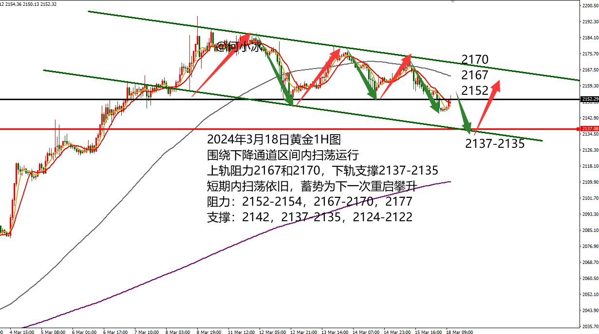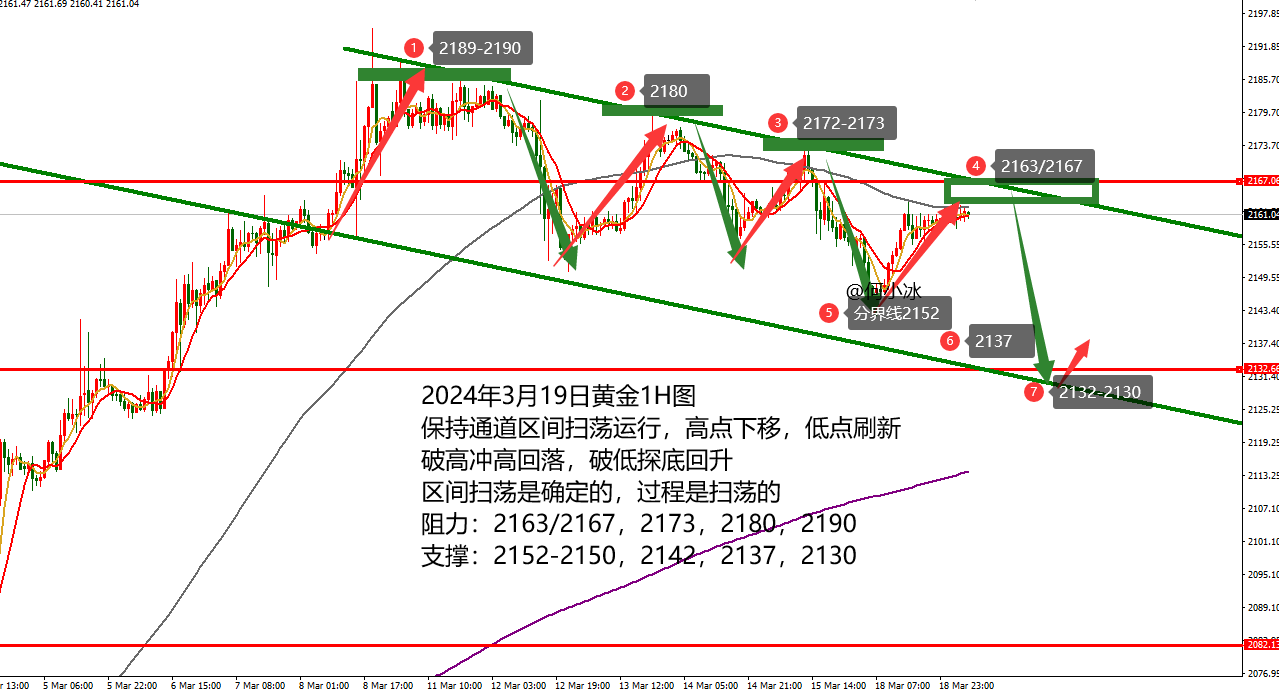 何小冰:黄金2167-2137高空低多,保持通道区间扫荡 黄金三月第一周强势上涨突破历史新高,第二周进入空间修正,上冲阻力承压回落,下探支撑反弹冲刺,大起大落来回扫荡 两点确定一条直线,四点形成一条通道,在上周跌回小时图双线区间内后基本确定进入空间扫荡,从而形成一条下降通道区间运行 刚好上周五确定了通道上轨的阻力2170-2172区域,再度承压下跌回落,前面两三次触及2152区域形成反弹,这一次再度来到这里,直接跌破进一步下跌至2146区域 当前仍是处于通道区间范围内,通道上轨区域叠加在2167和2170区域,通道下轨支撑叠加在2137-2135区域 上周的分析中,我们着重提及到2140关口