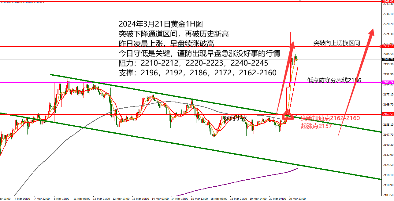 何小冰:黄金再创历史新高,守低继续低多 黄金前半周我们围绕下降通道区间,在2160关口反复做空看回落收获不错的利润, 昨日周三在美盘前仍是继续围绕下降通道区间运行,冲高就回落10美元的空间,然后持续横盘2157区域 凌晨2点美联储消息开启后,价格从2157直接拉升突破,扫荡式攀升冲刺到2188-2189区域,涨幅32美元左右,然后就直接横盘在这里 今日周四,早盘直接2186拉升突破历史新高去到2223,涨幅37美元左右,然后就开始扫荡了 第一波2186冲刺刷新新高2223,冲高回落回踩2194-2193,然后再冲高2206-2207区域 第二波,再度回踩2192-2193区域,然后拉升冲刺2
