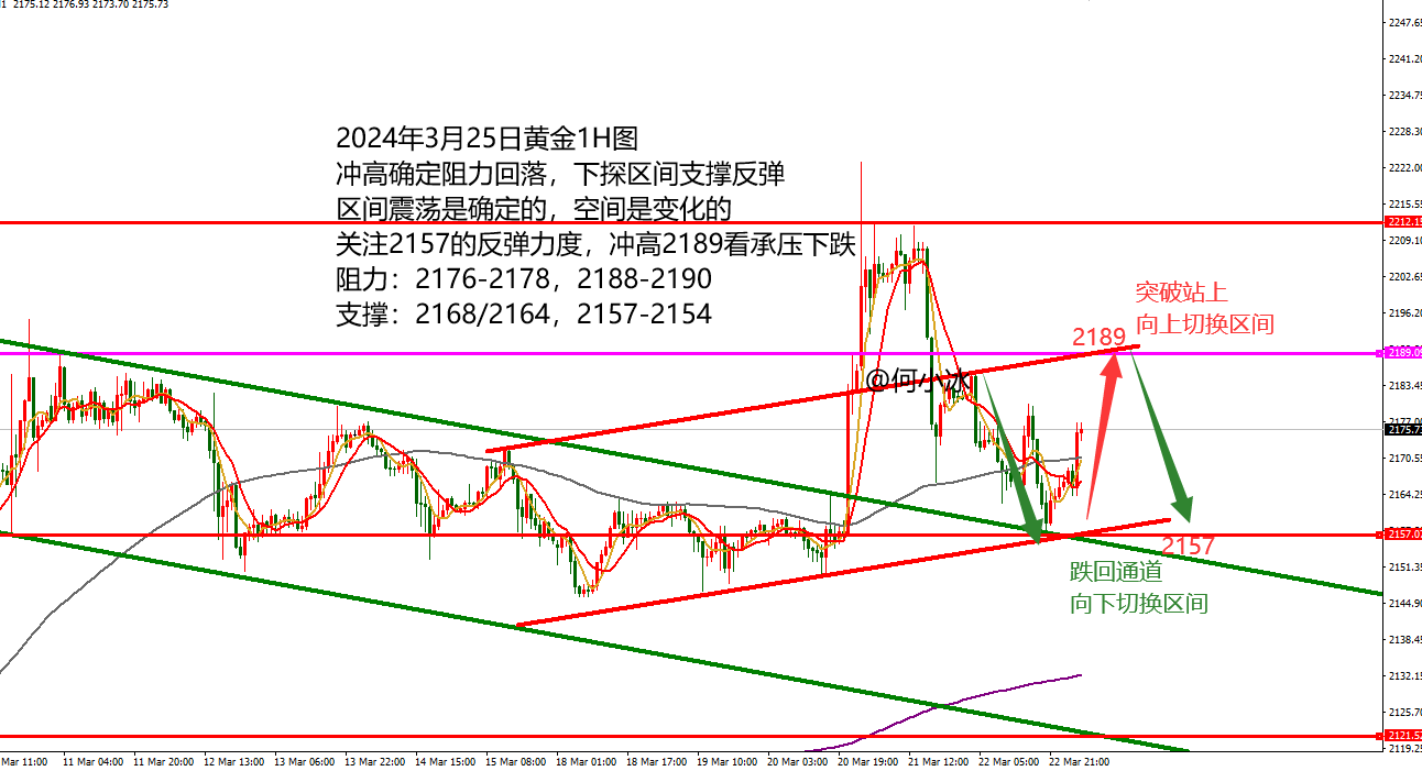 何小冰:黄金通道2167-2132扫荡,守高是关键 黄金今日周二(3月19日)涨跌尤为重要,继续保持确定通道上轨的阻力承压下跌,则还将继续延续下跌找寻通道下轨的位置, 那么不破下降通道区间,保持上涨过程中的空间修正不变 直接打破通道区间,日线连阳上涨,向上切换区间, 就要考虑是否上涨的空间修正要结束,若是结束,后续将启动继续攀升 而我们当前对于黄金的看法,还是处于第一种的情况,仍是处于上涨过程中的空间修正, 不破通道区间,保持通道区间内震荡运行,冲高阻力位置做空看回落,下探支撑破低后再看探底回升的扫荡 所以, 在参与上我们选择以通道上轨作为压力进行高空看价格回落 ,当然这过程中也会有偶尔的出