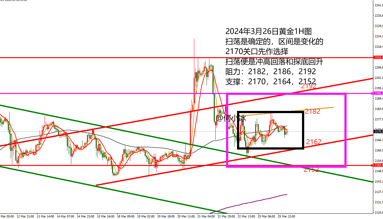 何小冰:黄金2170先作选择,美盘关注冲高和探底扫荡 黄金开启区间震荡模式,震荡是确定的,区间是变化的,注意变动的区间,随着时间推移进行空间的切换 在昨日周一的分析中,我们确定的方法是两条通道区间配合推算法(以小区间作为空间,推算延伸10美元范围) 现在价格仍是处于这个震荡的区间范围内,所以继续保持这个方法不变 梳理罗列关键点如下: 1、红色通道区间2162-2192范围, 通道上轨位置上移到2192区域,支撑逐次向上上移,呈现低点抬升,高点上移的节奏,注意低点的防守以及高点的突破 2、绿色通道线位置下移到2152区域 ,当然2157仍是需要关注的低点位置,此处作为空间的分界线,守住这里,价