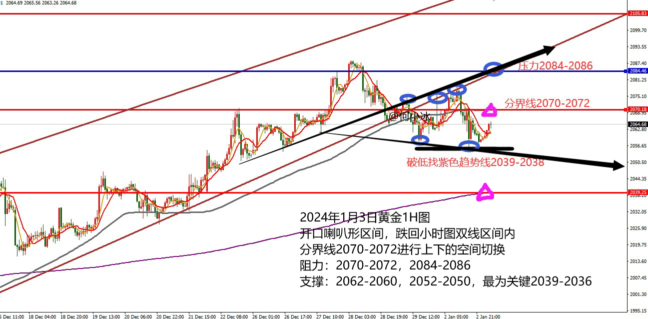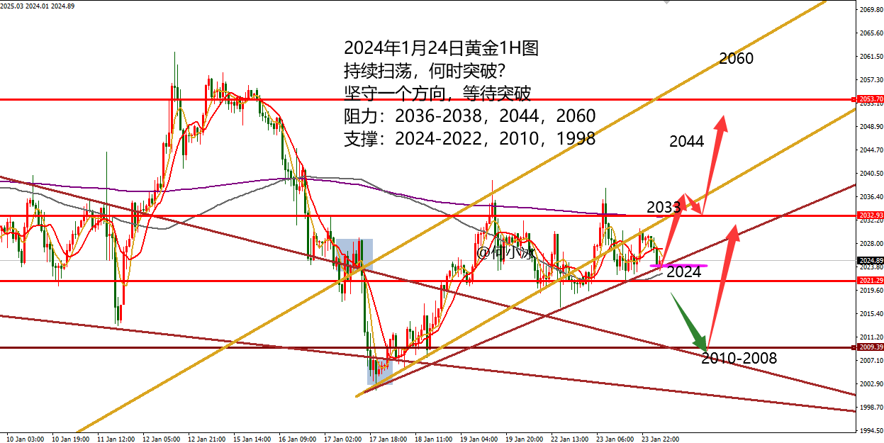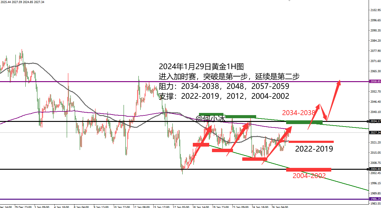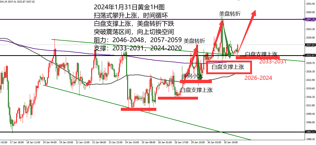 何小冰:黄金多头借东风突围,即小非农和美联储利率决议 时间来到周三,今日市场需着重关注 小非农ADP数据以及次日凌晨3点的美联储利率决议,随后美联储主席鲍威尔召开新闻发布会 作为2024年第一个美联储利率决议,其鹰派鸽派态度将为接下来一年的美联储货币政策提供重要的参考,所以需要着重关注。 另外黄金已经持续区间震荡的时间周期较长,急需外力来作为助推打开现有的空间, 本周超级央行利率决议配合非农数据周 ,是最佳的消息助力,能够借力扩大并且打开扫荡的区间就尤为重要了。 本周我们继续站队黄金多头, 由于上周持续震荡没有给出最终的选择,多空争夺进入到本周的加时赛,而黄金多头在加时赛开始初露锋芒,突破了