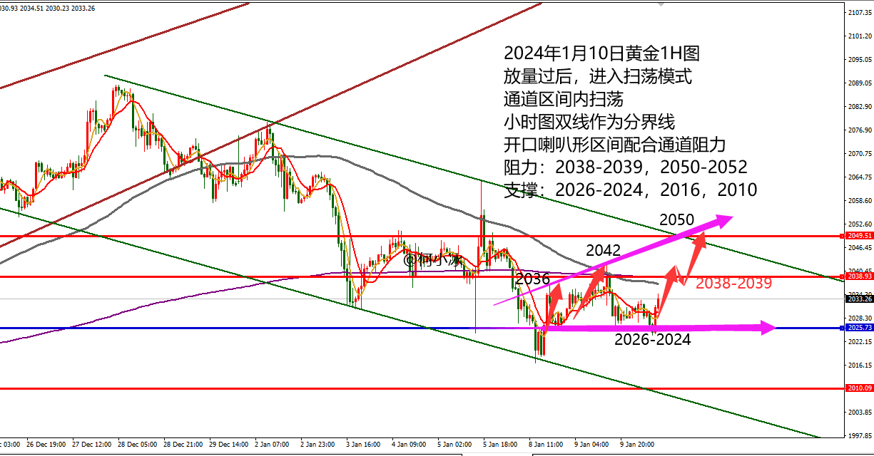 何小冰:黄金站队多头,冲2038再找2048 今天的黄金需要提前站队,而且界线很模糊的,找各自的防守线 1、站队多头,则以2026-2024区域做多支撑,看价格保持开口喇叭形的区间运行,低点持平,高点逐次上移,下一个阻力刚好与通道线上轨重合在2050关口区域 2、站队空头,以小时图双线2038-2040区域作为空间分界线也是作为做空的压制,再去看价格重新跌回2026的下方,继而找寻低点2016,再而破低找寻通道下轨的支撑2010区域 各自的防守线有了,接下来就是时间循环了,欧盘选定的方向,美盘延续,美盘过后走变数(可加速可转折的变数) 参考这个思路,我们在2030关口这个徘徊位置进行抉择,最