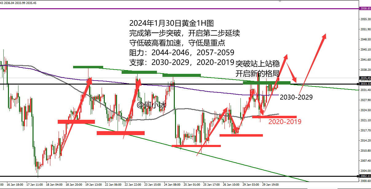 何小冰:黄金多头在加时赛初露锋芒,继续保持持多低多 黄金多空争夺拖到加时赛,现在多头占优,开始突破上周的震荡区间了 昨天提及,突破是第一步,延续是第二步 现在第一步突破已经完成,接下来将开启第二步的延续 在此过程中,关注守低破高的动作,守低是关键,保持低点上移,高点逐次突破,将更有利于黄金的上涨 从1月11日开始我们布局中长线波段多单计划, 参考历史循环看黄金下探确定支撑后的攀升(可看回1月11日的文章分析),现在波段多单仍在继续持有当中,接下来的行情走势就非常关键了,能否保持上涨,将历史再现。 主趋势确定了,在短线的参与上, 我们便是站队多头 ,回踩支撑低多,上冲阻力收获,再回踩支撑再低多