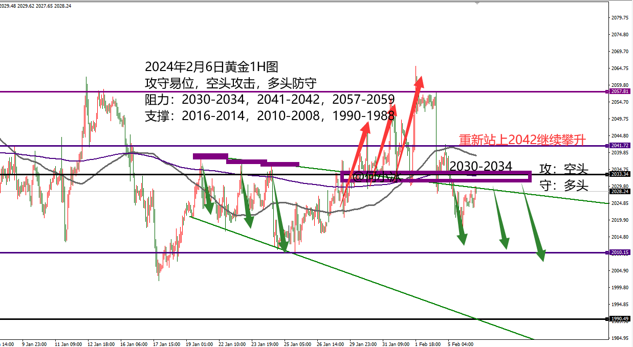 何小冰:黄金攻守易位,空头主攻多头主守 上周五非农,直接将黄金漂亮的上涨节奏打乱了,黄金从2002确定支撑开始攀升, 反复三次测试绿色趋势线沿线下跌 再度确定2010区域的支撑后蓄势启动攀升,突破绿色趋势线位置 强阻力转为强支撑,顶底转换2031区域, 围绕此处反复三次上涨突破高点 ,加速冲刺2065区域,这一波加速上涨的幅度差不多55美元 然后就是重头戏来了 周五非农直接扭转局势,涨多少,全部跌回多少! 本周周一开盘确定2042的阻力后开始承压下跌,欧盘跌破2030关口,美盘再破2020关口,尾盘进入探底回升扫荡修正 这一点刚好跟上周一完全相反 注意了,现在价格又再度跌回绿色趋势线的下方,