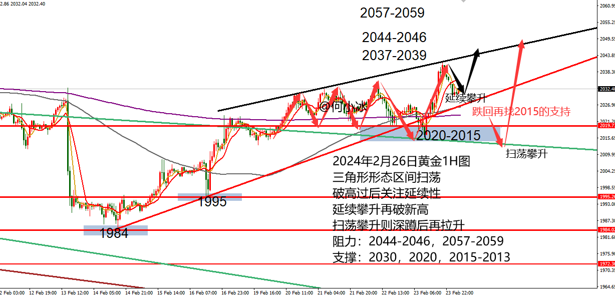 何小冰:黄金是延续攀升?还是深蹲后扫荡攀升? 黄金在上周周初,我们给出一个定义: 是否形成新一轮的上涨,在这过程中验证的空间分界线,便是绿色趋势线和小时图的双线。 因为在近期一个月的黄金走法中,以这个区域作为空间分界线, 在此之下空头掌握主导权保持承压破低的状况,在此之上多头掌握主导权保持支撑破高的状况 随着时间的推移,最终价格站上了绿色趋势线的上方,并在周五实现加速拉升破高的动作 不过过程非常的扫荡,围绕2020-2015区域形成支撑向上攀升破高,破高又再度回到2020关口,然后再继续向上攀升破高 那么,对于本周周初,首要关注的就是上周五尾盘的探底回升破高的动作,强势不深调,深调还是震荡