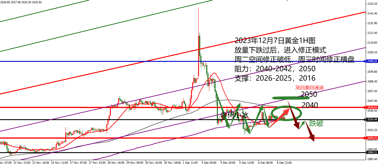 何小冰:黄金先多后再考虑空,原油放量下跌后看修正 黄金周一大起大落,冲高回落放量下跌,跌破上升通道区间 周二以通道线作为压制承压再破新低,过程偏扫荡式下跌 周三低位反弹进入横盘修正 三天的走法个各不相同,又相互连贯,强势弱势交替,守高破低加速,动能释放后的修正 那么到了今天还是要关注动能是否后修正的幅度和防守线得失 今日的视频分析中着重提及的位置是2040-2042区域, 此处是周二确定的阻力点和高带你,也是四小时生命线位置,也是小时图双线区间的上轨位置,多重阻力叠加在这里,需要重点留意 上一次的叠加位置是2020,价格测试后略破去到2010又重新回到这个区间内,然后依托下轨反弹攀升 那么今