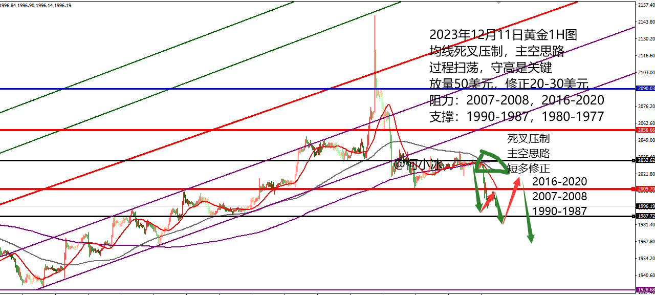 何小冰:黄金不破高点主空短多,原油冲高看回落 黄金再破新低去到1991,这是对上周周一高台跳水的延续,从上周周一刷新新高过后,价格开启了下跌模式 周一放量,周二扫荡下跌,周三周四和周五白盘箱体整理蓄势,周五美盘破低再度确定放了破低 今日周一,早盘价格压制2007-2008区域继续下跌,午后压制2000再破新低触及1991区域 一场风雨过后,接下来黄金的走势如何,将决定后半周的黄金节奏。 对此,我们归纳总结了三点: 1、小时图双线形成死叉压制, 这一点需要留意,唯有突破才能是多头重新回归,不然仍将成为压制作用 2、放量过后是修正,放量下跌的幅度在50-52美元,修正的幅度在20-30美元区间范