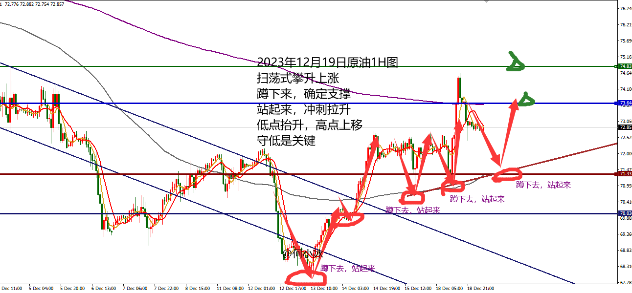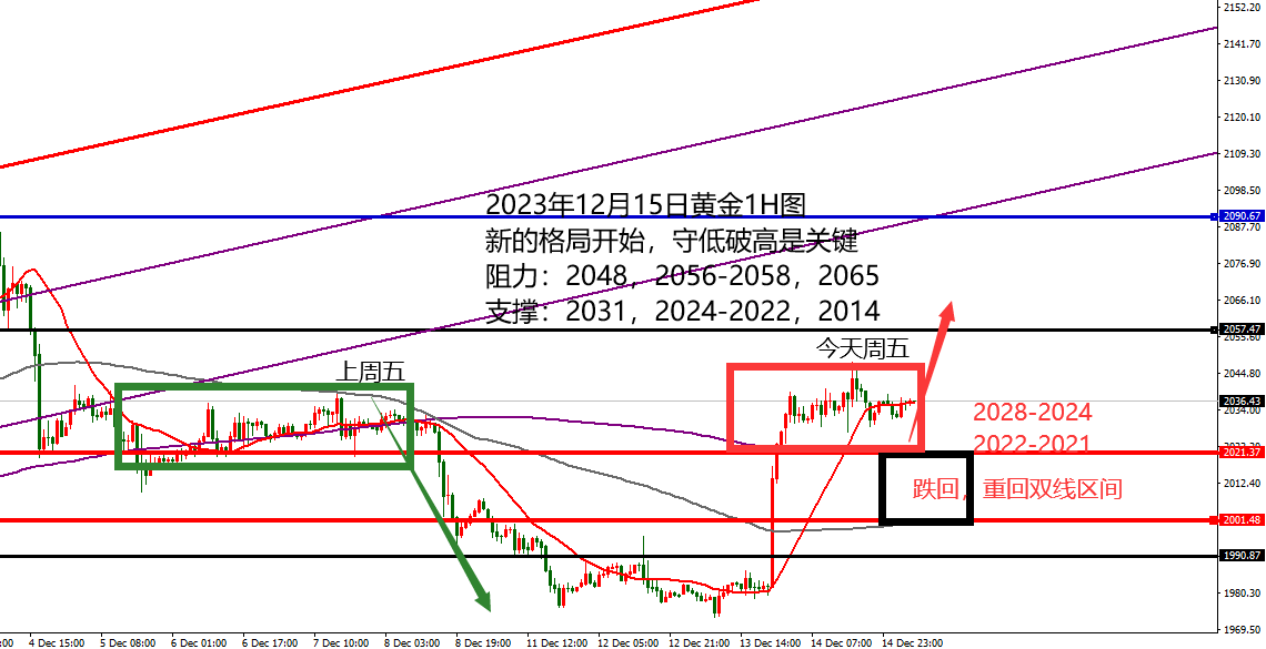何小冰:黄金能否再度形成金叉上涨?原油突破是关键 刚好过去一个月的时间,见过大起大落,大起冲刺历史新高,金叉作为助推;大落高台跳水扭转直下,死叉作为压制 现在走了一圈,来到这个时间点也将面临着选择,是否再度形成金叉? 若是形成成功,这一波下跌只是上涨过程中的修正,修正完成将助推黄金继续攀升。 综合来说,对于接下来的行情,我们需要注意以下几点: 1、圣诞节假期和元旦假期将近,这两个假期的将处于蓄势的阶段 ,整体行情会偏向于区间震荡,突破需要考虑延续性的问题,谨慎追单。 2、金叉助推上涨,死叉压制下跌 现在价格处于小时图双线的上方,双线区间2018-2010,关注此处的支撑区域,能够守住这里,从