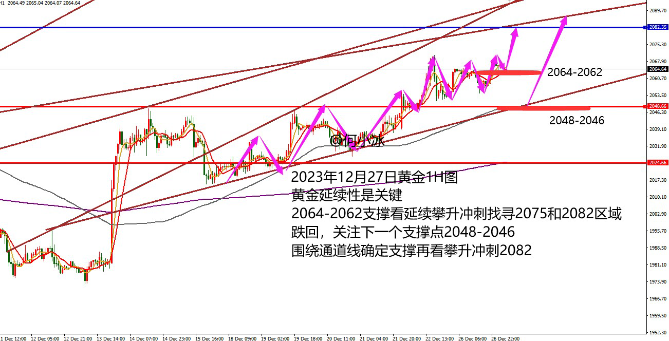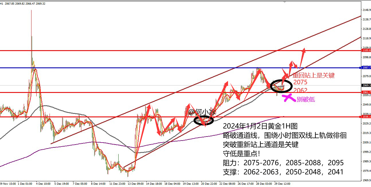 何小冰:黄金早盘多单如愿上涨,守低保持低多看涨 黄金早盘2063-2064的多单如愿上涨拉升冲刺2076.6区域盈利收获 昨日周一由于元旦假期影响,市场全天休市,今日早盘黄金开盘直接依托2063-2064拉升冲刺到2075.5,二次回踩2062后继续攀升冲刺到2076.6 然后,现在持续进行横盘调整修正 对于本周周初的黄金,我们需要面对的是选择:一是强势多头的回踩修正完成,后续继续高歌猛进?二是转折开始,强势搁置,短期内进入区间横盘和震荡? 对此,我们的看法是多头趋势未改变,回踩下跌继续理解为空间修正,修正完成继续向上进行攀升,跌多少,重新涨回多少 当然,一切的前提是守低,守低破高看加速,破