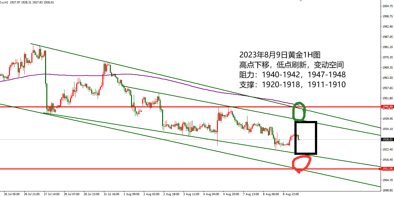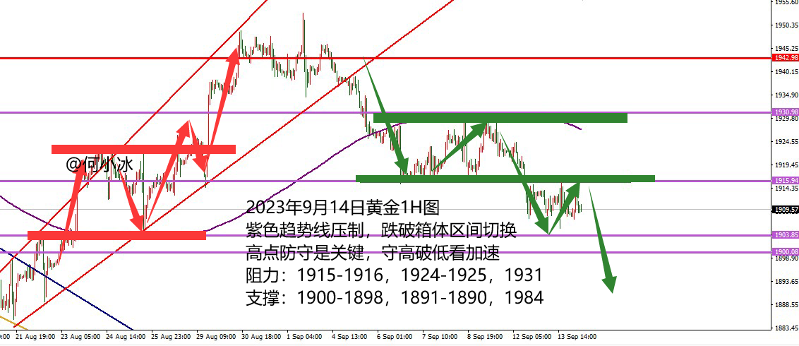 何小冰:黄金守高续跌,原油守低续涨 到目前为止,黄金本周的走法跟上周又有点相似了 同样是周二跌破区间,然后又开始进入横盘模式以及蚂蚁搬家模式,一点一点挪,动一下又不动一下的。 那么对于接下来的黄金,先明确分界线,守则保持节奏和区间,失守则转变思路和空间。 这个位置现在还是在1915-1916区域 ,随着时间推移, 四小时生命线也下移到这个区域范围 ,意味着后续行情空间能够压制在此下方,空头仍是占据主导权,正所谓四小时生命线之下,空头掌握主导权,生命线之上,多头掌握主导权。 第二点, 1915-1916位置也是上周价格跌破8月中下旬的上升通道区间后续跌触及止跌反弹的支撑区域,以这个区域形成支撑