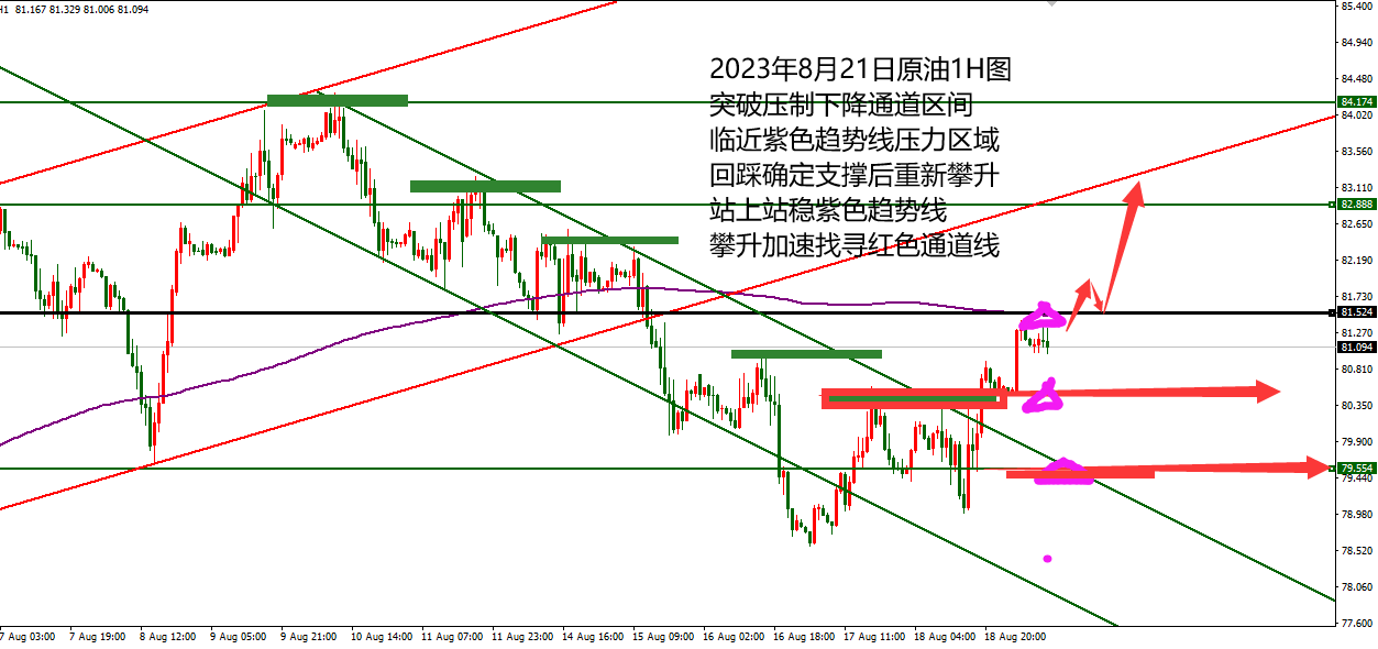何小冰:黄金进入空间修正,冲高易回落,下探易反弹 黄金进入8月份持续 压制在四小时生命线 进行走低破低, 昨日午夜过后价格再度探底回升确定1886的支撑点后, 首次突破四小时生命线位置, 并且依托生命线向上进行攀升走高。 出现不一样的节奏,也符合今日午间视频提及的黄金将进入空间修正,将区间进行扩大,冲高回落和探底回升相互配合,蓄势等待下一次的方向选择。 而前期的高点和反弹确定的阻力点将是空间修正的重要分界线。 比较临近的阻力点1904,其次1911-1913,最后上周的高点1916-1917区域 紫色趋势线位置在1908, 进行综合叠加的阻力区域将是出现反弹需要关注的阻力区域。 昨晚提及阻力