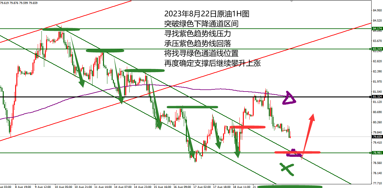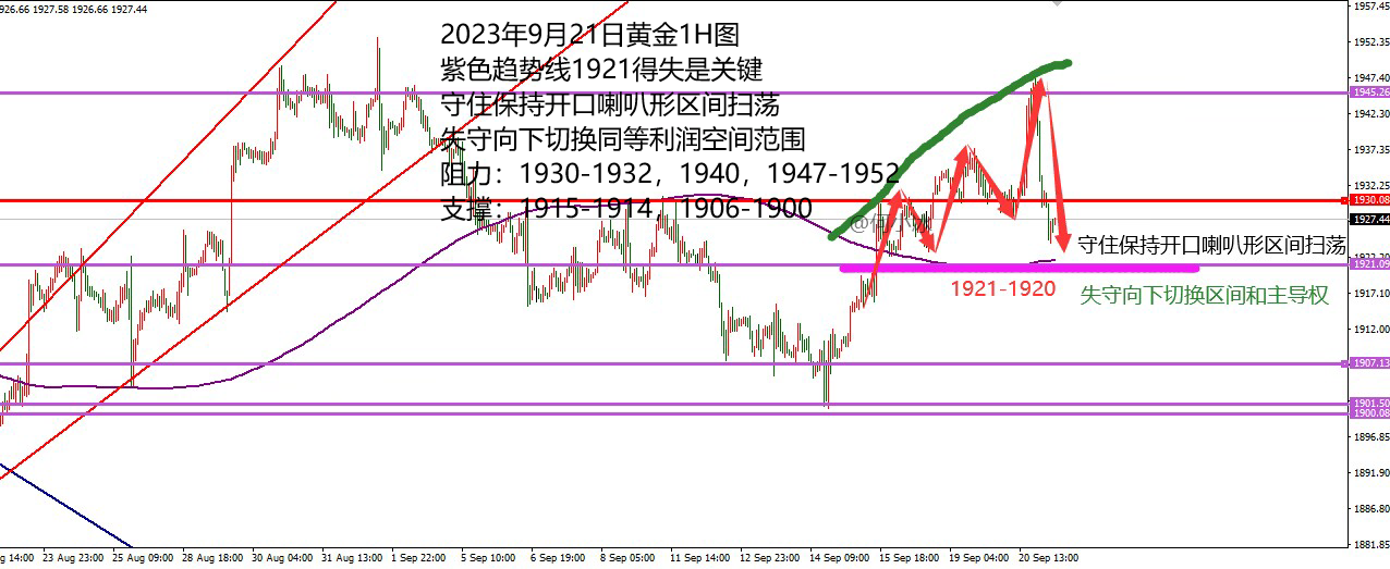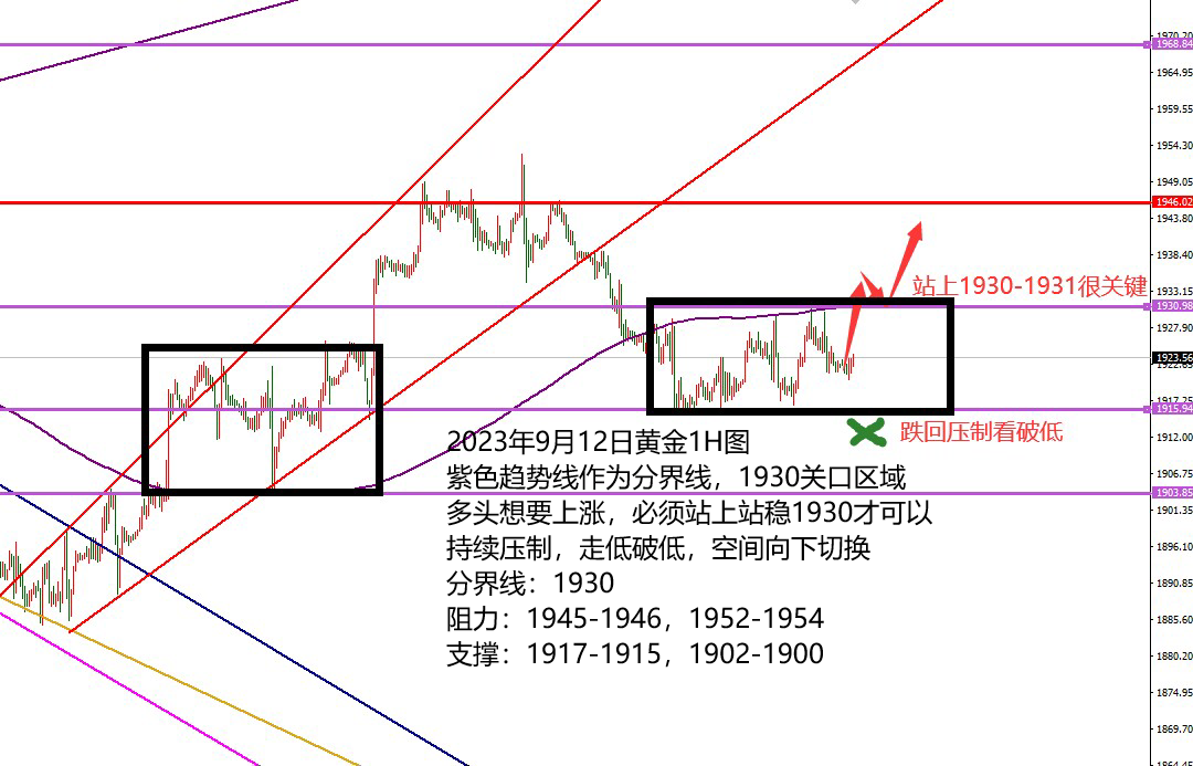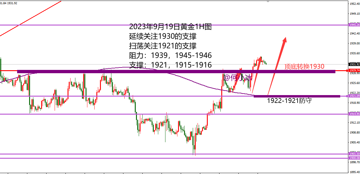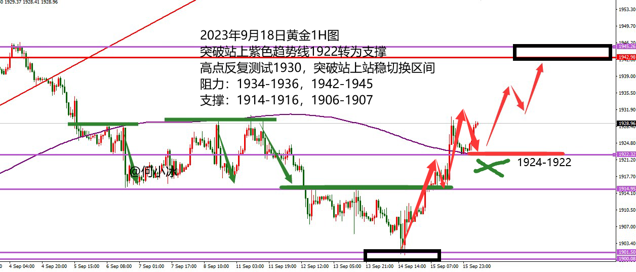 何小冰:黄金站上1930切换震荡区间,原油守低看新高 黄金上周兜兜转转又回到1930关口等待选择 前半周承压1930关口跌破1915加速下跌寻找到1900关口,后半周支撑1900关口涨破1915重新找寻1930关口,跌多少,又重新涨回多少,将行情的空间重新拉回此前的震荡区间范围内。 对于本周的周初黄金来说,前半周仍是需要以区间震荡来对待,只是分界线上的选择非常关键, 后半周特别是从周四凌晨开始进入美联储利率决议干扰的消息行情走法,到时再具体情况具体分析。 而从当前的黄金节奏来看,我们总结了三点: 1、小时图紫色趋势线由阻力转为支撑,在1922区域 此前价格跌破8月中下旬的上升通道区间,并且失