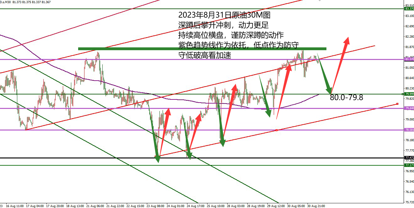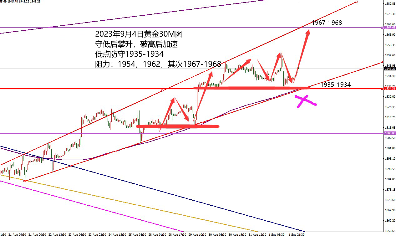 何小冰:黄金1935很重要,原油蹲一下更有力气涨 黄金开启金九银十的行情,八月份的整体走势上以前半个月阴跌破低,到后半个月扫荡式攀升! 现在还处于后半月的扫荡式攀升的过程中,很有意义的是上周周四周五与前一周的周四周五走法相似,周四围绕10美元区间窄幅震荡,周五冲高回落,探底回升,下探触及红色上升通道线位置止跌反弹,继续回到横盘区间现在。 前一周的周五价格回踩到达红色通道线的1904位置止跌反弹价格徘徊1910的上方区域 上周的周五价格回踩到达红色通道线的1934位置止跌反弹 价格价格徘徊在1940的上方区域 若是循环, 则将直接防守1935-1934区域向上攀升,逐次寻找上周五的高点1954