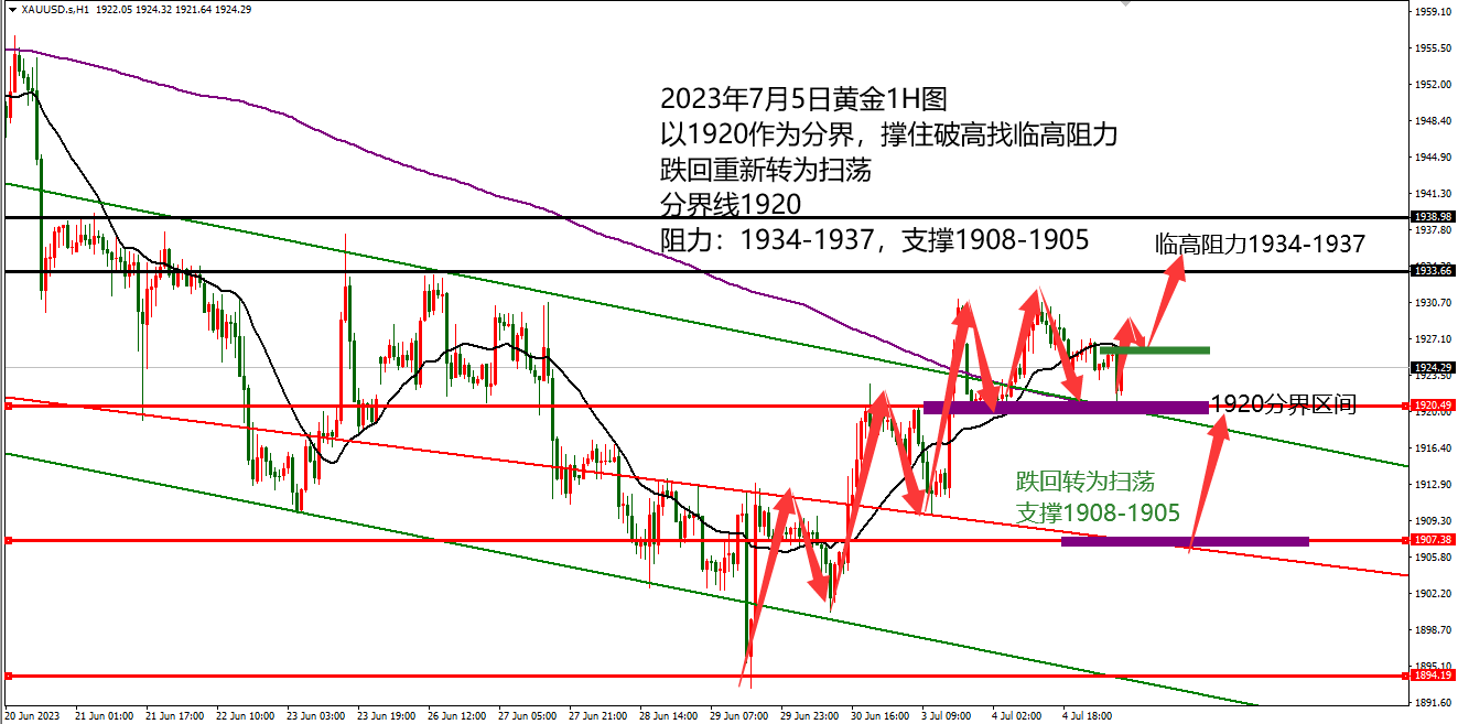 何小冰:黄金1920分界,定延续攀升和扫荡攀升 黄金前两个交易日是对上周四周五的探底回升收阳破高的延续,价格回踩确定1910的支撑后向上攀升寻找1930-1931的阻力区域,当前仍是在这个区域范围内。 一个空间换一个空间的扫荡,从1900-1920转换到1910-1930,现在价格在1920的上方,能够守住1920的支撑区域, 下一个切换的区间将是1920-1940。 这也是上午的视频讲解中着重 提及1920分界线的原因之一 另外两个原因,一个是四小时生命线1920,一个是紫色趋势线和绿色下降通道线上轨叠加支撑1920 支撑都是重合在1920关口,还是昨日的低点位置,守低破高看加速的节奏以及