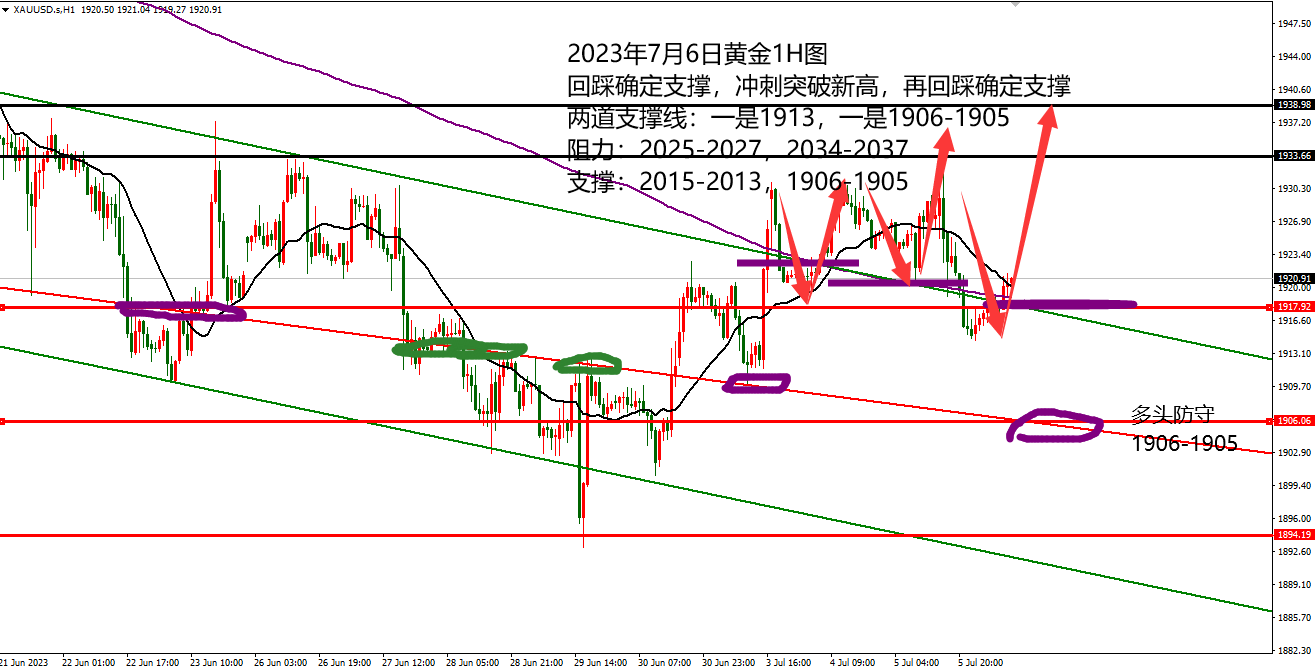 何小冰:黄金1913支撑延续攀升,1905支撑扫荡攀升 时间来到周四,今晚小非农登场,明天晚上非农亮相,留意最新数据结果,届时市场价格会有明显的波动。 黄金 从上周四形成探底回升过后,周五回踩1900关口形成支撑向上攀升,本周周一回踩1910关口形成支撑继续向上攀升,周二周三均是支撑1920关口向上去攀升寻找临近高点的。 现在时间来到周四,整体的阶梯式上涨结构仍是保持完好,守低破高节奏仍是保持不变,那么还是看循环上涨的思路 也就是,每一次冲刺之前,都有回踩修正的动作,回踩确定支撑后继续冲刺突破高点,再回踩确定支撑,然后再形成冲刺 以阶梯式向上攀升的形态,保持上涨的节奏和动力。 回踩修正的过程
