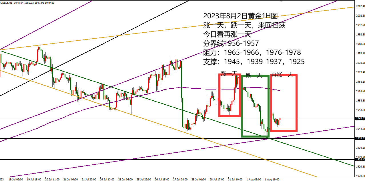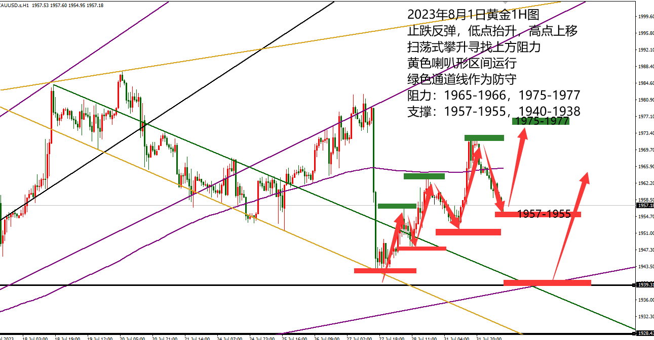 何小冰:黄金明显的扫荡不延续,20美元切换区间 黄金昨日从大周期上归总思路,当前价格处于黄色开口喇叭形区间范围内, 价格不突破之前,下跌理解为多头的空间修正, 黄色喇叭形下轨位置反复测试止跌反弹,现在黄色喇叭形下轨位置继续 下移到1928区域, 比较临近的趋势线是绿色通道线,也是这一轮启动空间修正下跌的压制线,突破转为支撑点。 与前期的 紫色上升趋势线叠加在1939区域。 上周周四价格短线大幅度下跌刚好触及黄色喇叭形下轨1942区域止跌进入反弹,周五延续扫荡式攀升上涨,昨日周一继续延续上涨。 低点抬升,高点上移,逐次向上攀升,过程存在扫荡性,也就是冲高易回落,探底易反弹。 如图所示,价格低点