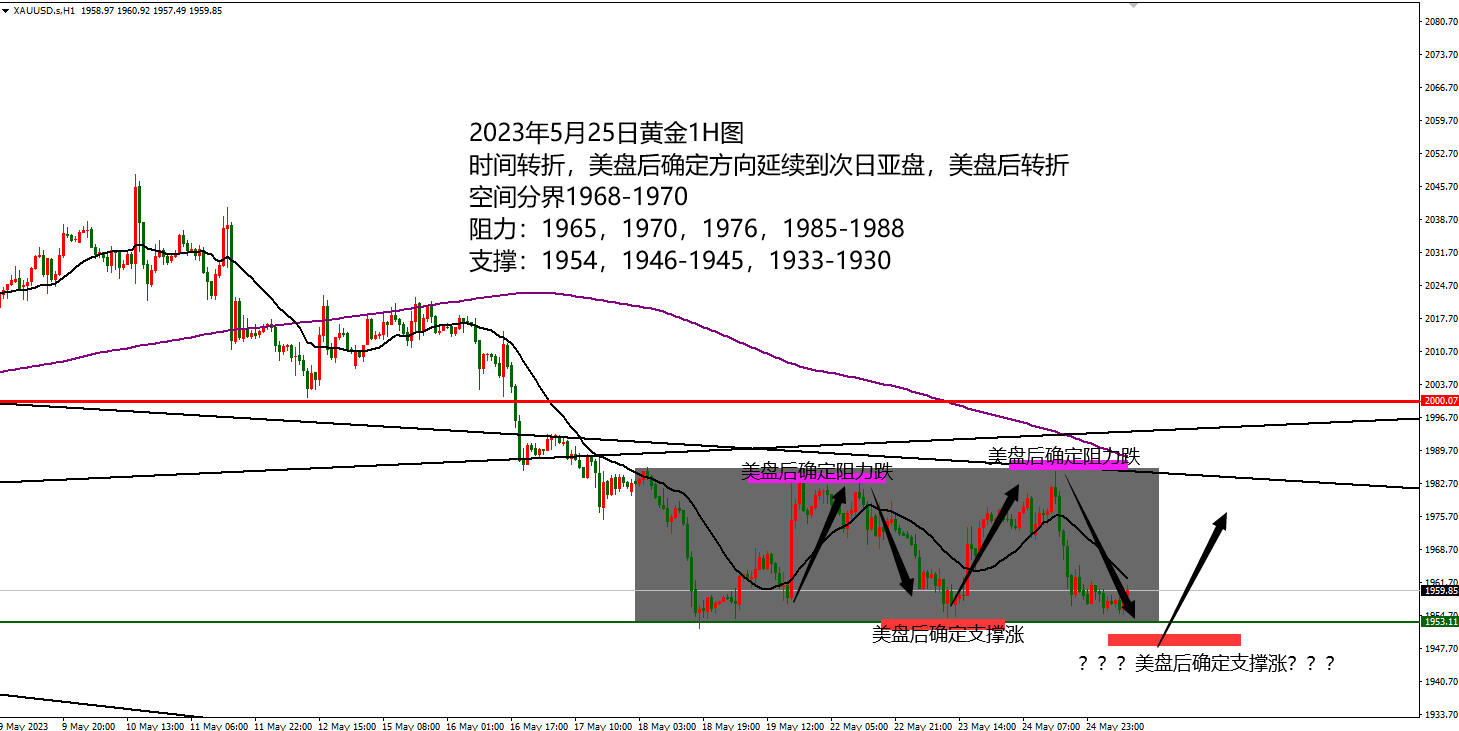 何小冰:5月25日黄金是否循环上涨?原油破高得加速才行 时间来到周四,今天的黄金会循环上涨? 前面三个交易日围绕1969-1970作为分界进行空间切换和美盘过后的时间转折,来回的进行扫荡, 上涨的时候看似势如破竹,实际为了冲高回落,下跌的时候看似摇摇欲坠,实际为了探底回升,美盘过后确定支撑阻力就是启动和加速,一气呵成,不带喘气。 现在时间来到周四的欧盘,黄金应该怎么看?我们总结了三点: 第一点,日线阴阳交替,围绕箱体区间来回切换, 注意延续性,破高破低过后价格不延续,将重新回到箱体区间内,所以到达支撑需要谨防探底回升,到达阻力需要谨防冲高回落。 第二点,时间转折, 周一周三美盘后确定阻力下跌