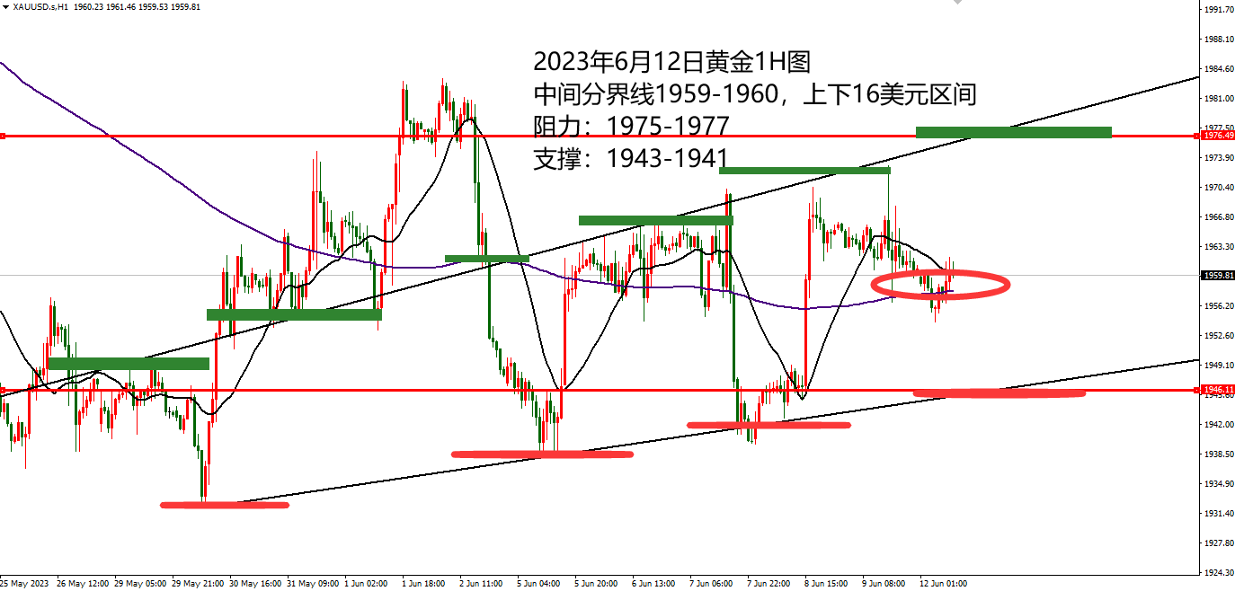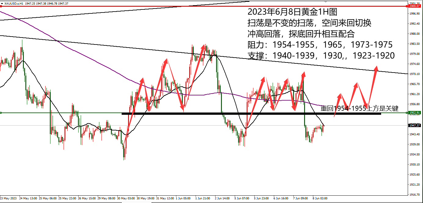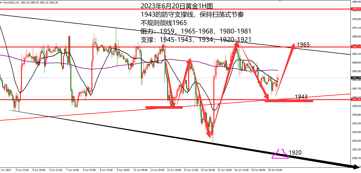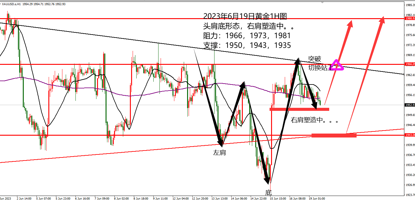 何小冰:黄金1943-1965震荡,突破切换同等幅度空间 昨日周一受到美盘假期休市的影响,黄金冲高受阻回落徘徊在1950关口区域结束当天的行情。 今日周二早盘价格承压回踩1945区域后形成探底回升的动作,午后价格重新回到1950的上方,价格继续向上上涨寻找1956区域位置。 昨日的分析从周线级别到小时图级别进行分析黄金的整体行情节奏,得出的结论是: 黄金现在处于头肩底形态的右肩塑造过程中,两个位置看价格的攀升, 一个是1950作为支撑,另一个是1943作为极限防守支撑 ,然后向上看黑色趋势线叠加的阻力 1965-1968区域 ,此处作为前期的强阻力,能够突破将转换为强支撑,然后再继续向上看非