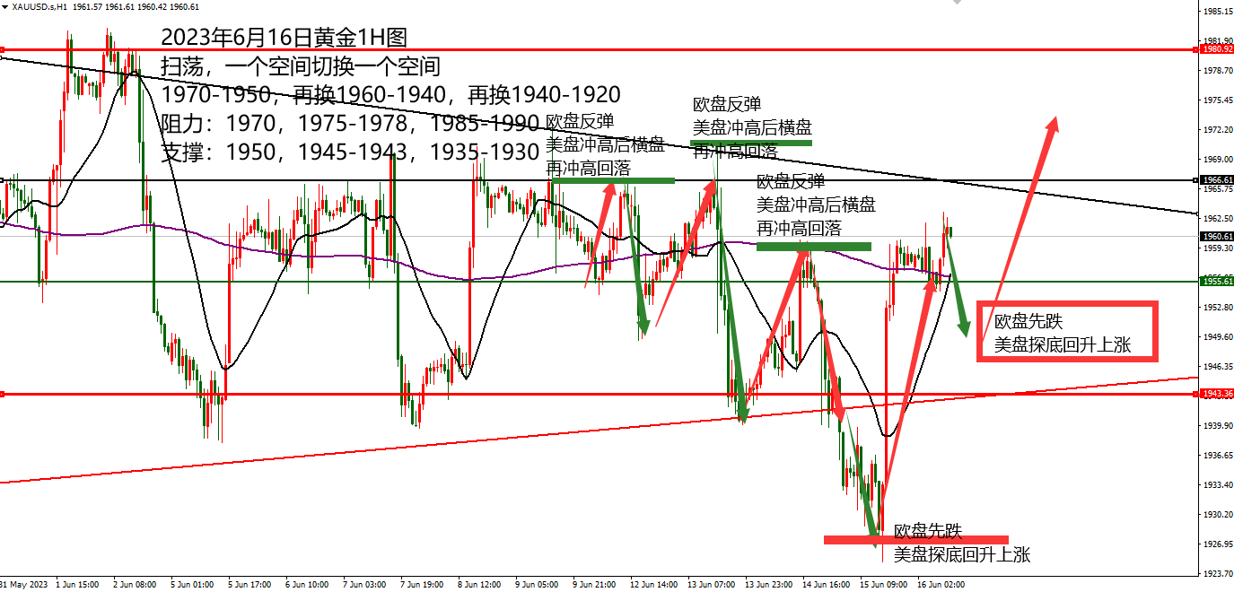 何小冰:黄金1955支撑续涨,1943支撑头肩底涨 价格又回到1960关口,魔幻的一周,兜兜转转又回到周初的1960分界线区域。 前面三个交易日扫荡式下跌,每一次欧盘的反弹,都是为了美盘确定阻力的冲高回落下跌做准备 ,破低过后继续横盘,然后在第二日继续循环。 然而昨日周四的节奏不一样了,欧盘持续走低破低的下跌,美盘过后平地起飞 , 一气呵成上涨超30美元,不带喘气的一口气涨到1960,然后高位横盘。 具体走势: 周一欧盘反弹找1967,美盘冲高回落破低 周二欧盘反弹找1970.9,美盘冲高回落破低 周三欧盘反弹找1960,美盘冲高回落破低 周四欧盘下跌找1925,美盘探底回升破高 再来看空间