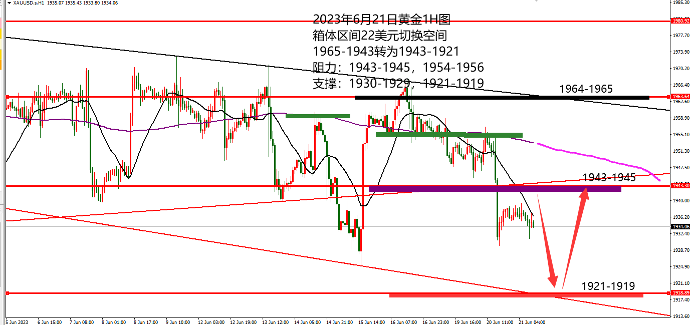 何小冰:黄金空间切换1943-1921,注意延续性 黄金在昨日周二美盘走了一波较为明显的延续性下跌,价格压制1954.5下跌至1930-1929区域,一气呵成的下跌,然后进入到横盘修正,整体行情空间从此前的1965-1943,转到了1943-1921区域。 现在时间来到欧盘时段,黄金还是保持1940-1930的区间进行窄幅震荡运行。 如图所示,前面价格反复依托紫色趋势线向上攀升寻找阻力,到了周二价格反复压制紫色趋势线向下放量下跌,价格压制紫色趋势线的同时失守小时图生命线,从而形成失守双线的放量状况。 但是,放量过后又是低位横盘修正,这就为后续的行情增添难度了。 从延续性行情的角度看, 日线上