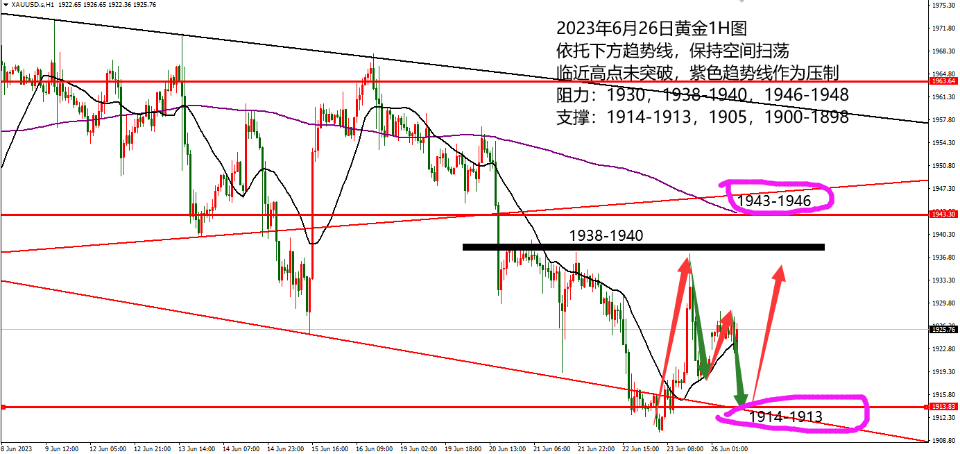 何小冰:扫荡依旧,黄金先空后多 黄金前一周的尾盘价格探底回升大阳过后,收取了调整十字星,在十字星过后,上周黄金周一收取了阴K线,跌破低点,同时将形态转为压制,接下来的周二周三周四都没有突破高点,不断的收阴下跌,高点不断下移,低点不断刷新,逐次向下走低寻找到下方的趋势线位置。 前一周第一次触及趋势线位置1925,价格探底回升大幅度上涨。 上周第二次触及趋势线位置1919,也有反弹,力度相对小一点, 去到1937-1938区域 然后第三次触及趋势线位置1916-1914,价格没有明显弹开的动作,同时再破低点去到1910区域,一直低位横盘再横盘 直至周五价格重新回到趋势线1916-1914的上方,
