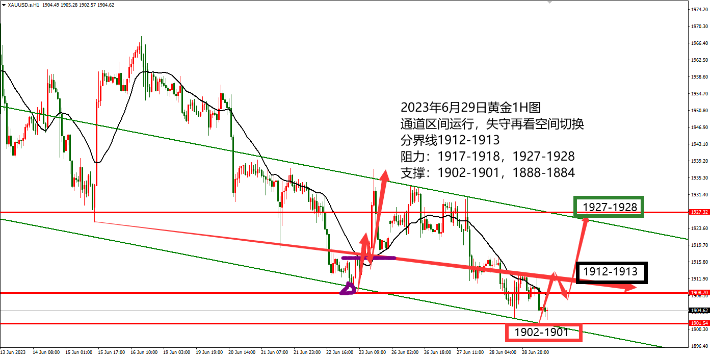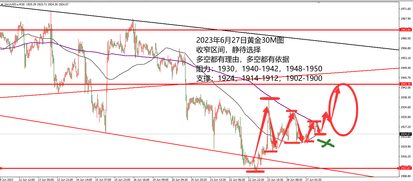 何小冰:黄金1901-1927通道运行,原油守低破高看续涨 一问如果要跌,为何昨晚压制不跌,不开闸放量跌? 二问如果要涨,为何支撑反弹不破高点,扶摇直上涨? 三问为何挑衅人心,看涨不涨,看跌不跌, 持多看到的都是上涨信号,持空看到的都是下跌的信号 现在时间来到周四的欧盘,黄金高点下移,低点刷新三连阴下来,整体形态看着都是跌,压制非常明显,因为临近的高点尚未被突破,但是,但是来了,也没有放量大跌。 就是一点一点的挪下去,看似摇摇欲坠,实则稳如泰山,一个空间换一个空间。 似乎没什么消息能够让黄金把步子再迈大一点,只能小碎步小碎步的挪动。 那么,对于接下来的黄金,到底应该怎么看? 这里我们归结为三
