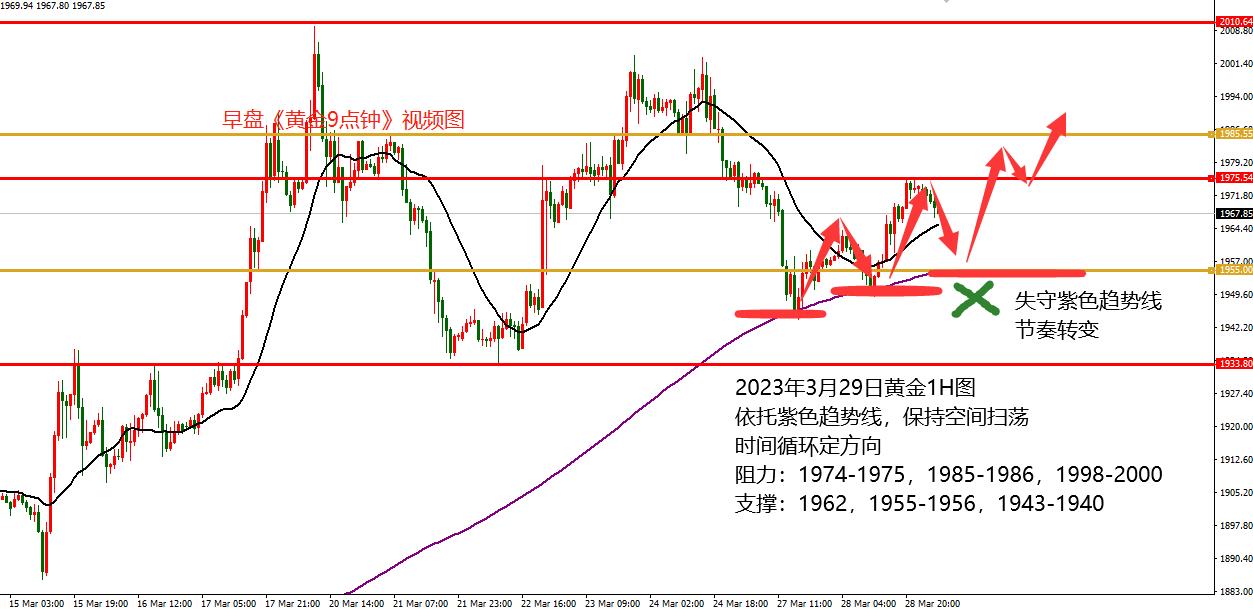 何小冰:黄金1968分界切换区间,原油注意空间修正03.29 震荡是确定的,区间是不定的,用来形容最近的黄金,空间扫荡明显,空间幅度很大,确定支撑就是涨,确定阻力就是跌。 就像昨日确定1950-1948的支撑,就是蹭蹭的涨,涨到1974-1975的位置 今日早盘价格直接压制1974-1975,哗啦呼啦的跌,直接就跌到1959 等于昨晚美盘回踩1959的继续上涨,现在又全部跌回来了,涨多少,跌回多少。 继续保持扫荡。 早盘《黄金9点钟》的分析还是给了时间循环和空间切换的分析。 空间点上最为关键的是小时图的紫色趋势线1955区域, 作为行情空间的分界线,能够守住此处,价格保持上方的区间扫荡,向上