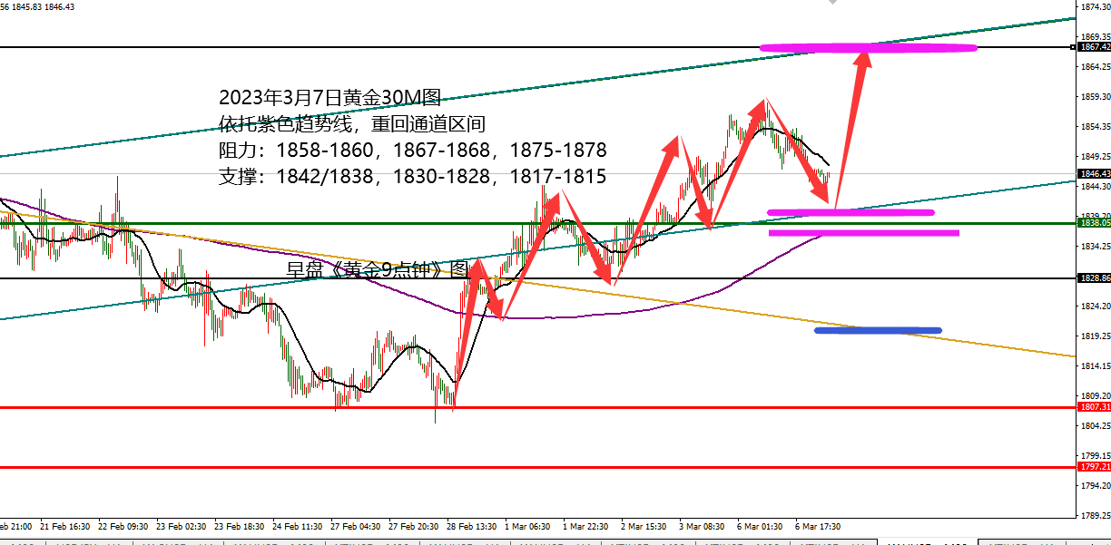 何小冰:黄金1837-1867区间震荡,原油扫荡攀升03.07 今 晚23点有美联储主席鲍威尔的参议院证词陈述 ,明天还有在众议院的证词陈述,需要重点留意,届时对于市场行情的影响会比较明显。 次日凌晨关注EIA月度市场报告和API原油库存数据,对油价有直接的影响。 黄金 昨日周一先是延续冲刺破高到达1858上方区域,然后价格冲高回落向下走低,美盘时段反复测试1853-1854区域,仍是无法突破。 今日早盘,价格承压向下寻找到1844区域,此处也是前期的顶底转换区域。 价格依托此处再度攀升寻找1850关口区域的阻力。 震荡依旧,过程扫荡明显,延续性是关键。 当前价格处于紫色趋势线以及重回通道区