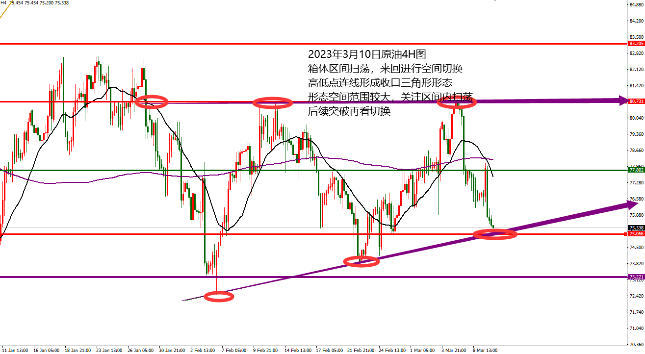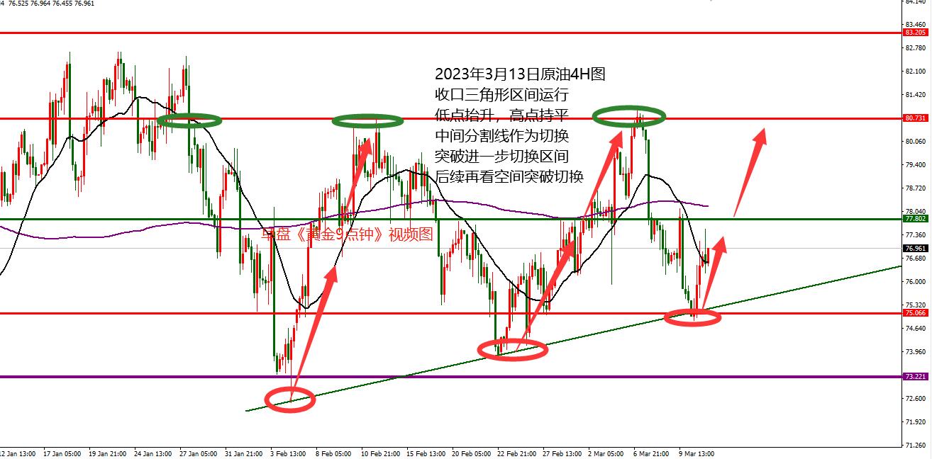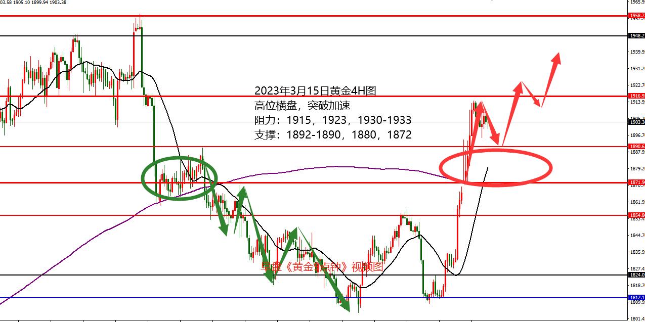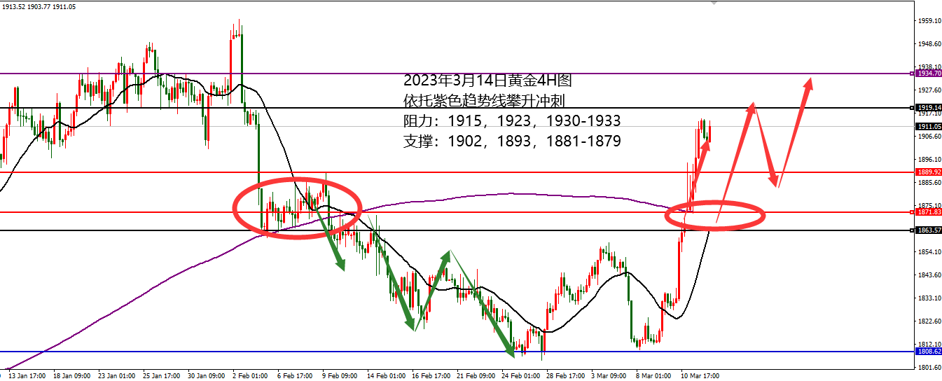 何小冰:黄金三个支撑三种节奏,原油收口三角形区间03.13 本周开始进入夏令时, 美盘开盘时间提前一个小时为20点30分,留意交易时间变化。 2月份的非农之夜,黄金续跌大跌放量下跌,3月份的非农之夜,恰恰相反,黄金续涨大涨放量上涨。 进入3月份,黄金整体扫荡式攀升上涨的节奏,上周因为周二的消息带动,价格大幅度下跌,走出了一个意外的深蹲,深蹲过后就是平地起跳了,依托1810关口,收复1830,然后站上1830继续冲刺,突破高点1858进一步走高破高。 今日周一早盘价格进一步攀升寻找到1894区域。 至此,价格突破站上30分钟图的紫色趋势线,然后依托四小时生命线寻找到四小时紫色趋势线位置,今日早