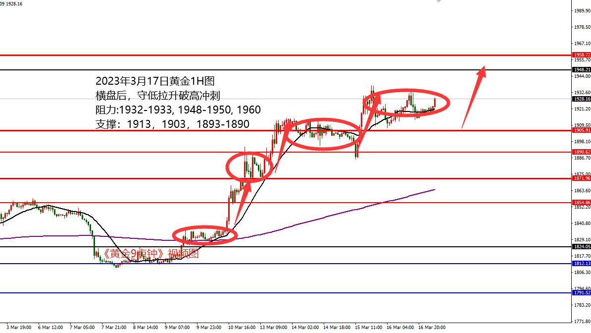 何小冰:黄金修正过后破高延续是关键,原油宽幅区间修正03.17 黄金本周周一周三两个交易日强势拉升突破,周二周四两个交易日则是空间修正,蓄势待发。 周一开盘跳空高开高走,依托1872区域作为支撑拉升走高将近44美元,而周二则是进入空间修正,差不多是上涨的50%的修正幅度 周三价格回踩1885作为支撑,延续性走高破高将近52美元,昨日周四同样是进入空间修正,差不多是上涨的50%的修正幅度。 价格启动时,以时间修正为主,横盘后续涨拉升冲刺; 价格修正时,以空间修正握住,触及支撑弹开,触及阻力弹开,价格来回扫荡。 在经历了昨日周四的空间修正过后,今日能不能破高继续走延续就尤为重要了。 在《黄金9点