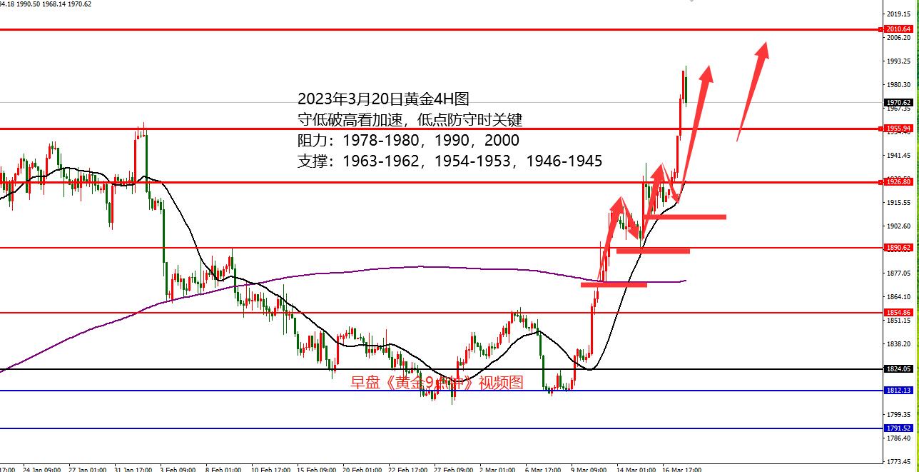 何小冰:黄金破新,原油破新低,注意延续性03.20 黄金原油均是快节奏行情,分析跟不上实时价格变动,但分析可以缕清思绪,避免情绪交易。 黄金今日早盘冲1990关口后承压回踩1868区域的支撑,然后就是确定支持的强势拉升冲刺,午后突破新高1993,二次回踩1982-1981后继续拉升冲刺,加速冲刺到2009-2010区域,然后又再度进入修正。 确定支撑后就是势如破竹的拉升冲刺,然后再进入空间修正,修正过后破高继续冲刺。 午后价格突破新高后回踩1982-1981区域向上攀升,我们以此处下方作为止损点, 参考介入1988区域的多单,看价格加速冲刺1998-2000关口, 价格如愿加速冲刺到达。 二