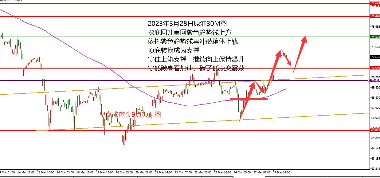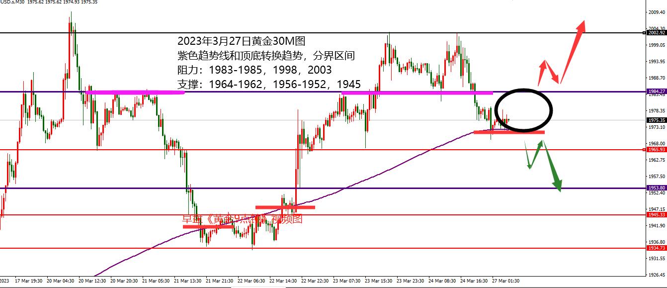 何小冰:黄金守低破高转节奏,原油续涨再加速 03.28 黄金昨日周一延续了上周的宽幅扫荡行情,延续上周五尾盘的冲高回落行情,价格压制1980关口下方,震荡走低,高点下移,低点刷新,直至美盘过后,价格加速下探至1944区域,才开始震荡反弹。 这里有一点需要留意的是: 冲高回落,次日延续,探底回升,次日延续 上周一冲高回落,次日周二守高延续下跌 上周三探底回升,次日周四守低延续上涨 上周五冲高回落,本周周一守高延续下跌 那么在昨晚尾盘出现探底回升的情况下,今日若能守低,破高,价格有望延续上涨。 守低这一点的概念有点模糊 ,可以是昨晚最后确定的支撑点,也可以是昨晚的低点,这里刚好有一条线在 那就是