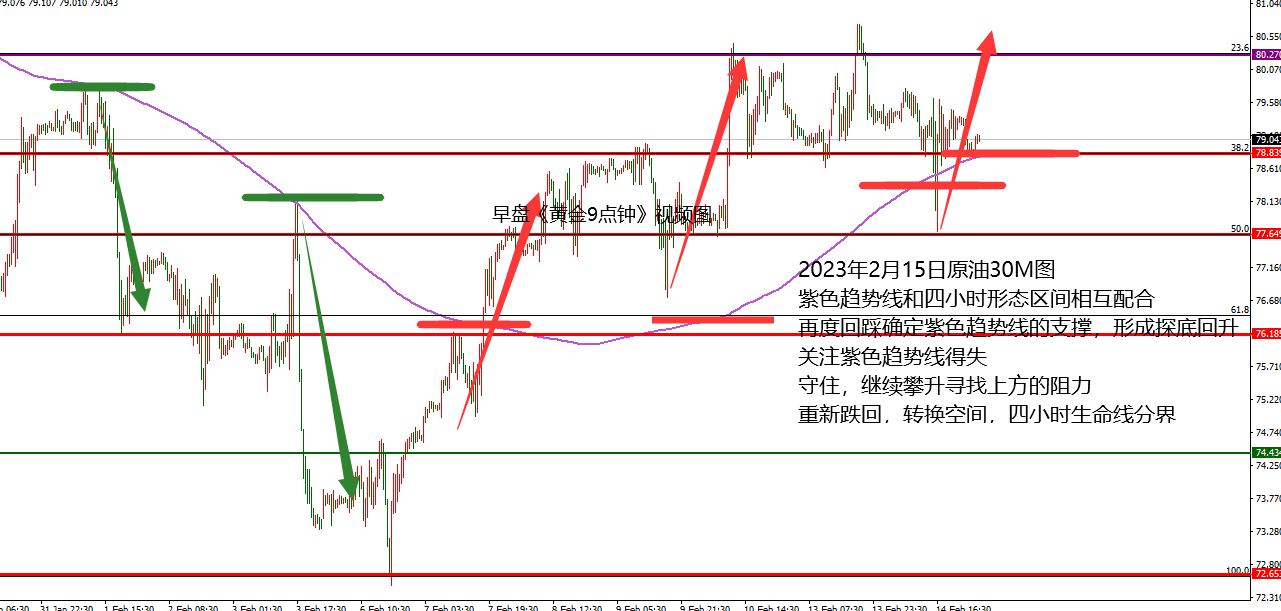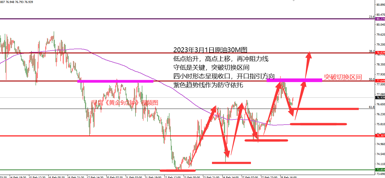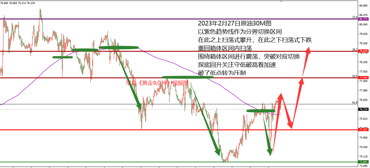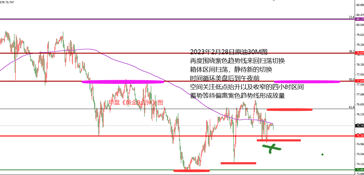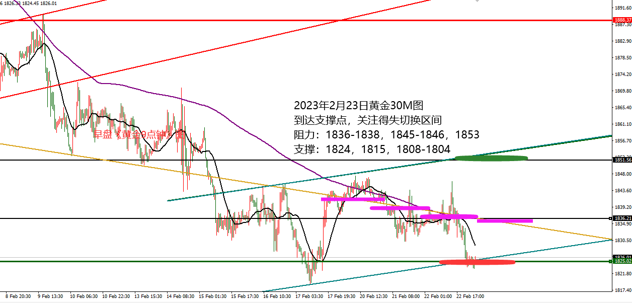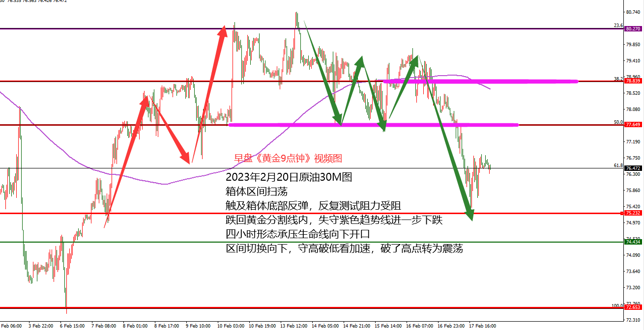 何小冰:黄金1825分界定区间,原油时间循环 02.23 黄金来到周四,在上周五价格加速下跌破低形成探底回升后,本周前面三个交易日仍是空间修正。 亚盘支撑反弹,欧盘扫荡,美盘扩大扫荡的区间。 可以明显看到的是亚盘时段价格震荡走高攀升寻找阻力,午后欧盘加速冲刺阻力点,然后快速冲高回落,加速下探破点,然后继续横盘,美盘时段又短线拉升冲刺,然后又冲高回落。 扫荡明显,空间幅度也在扩大。 四小时形态区间继续收窄,伴随着时间来到周四,形态上的开口也将指引新一波新的比较有延续性的行情,因为现在的黄金扫荡较为明显,不延续是最大的特色。 昨日提及的四小时收口区间与通道上下轨区间相互重合叠加,刚好也是符合空间