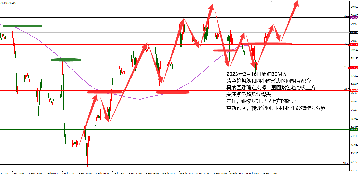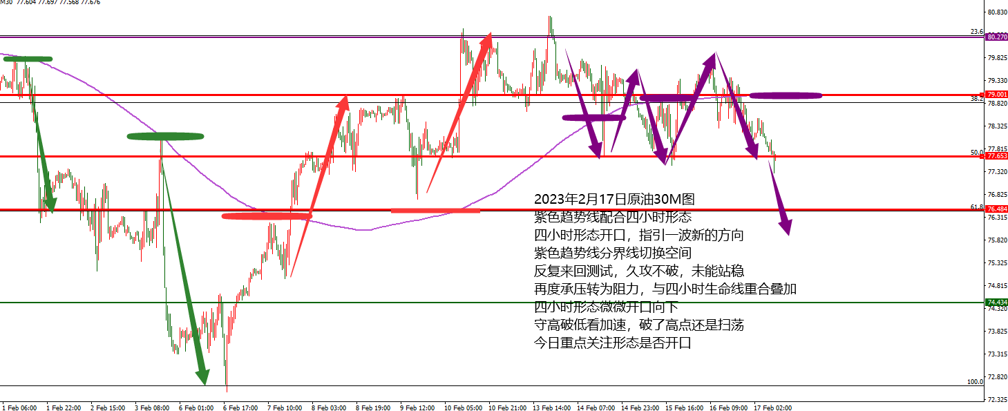 何小冰:黄金又是先空间修正,原油守高仍是承压02.20 今日周一,由于美国假期影响,美股休市,黄金原油将提前收盘,留意交易时间变动。 技术面上,黄金 上周扫荡式下跌,形态上压制明显,过程偏向于扫荡,最终结果是下跌,但每一次下跌之前都有明显的冲刺反弹确定阻力的动作,每一次破低之后伴随着的是探底回升的空间修正。 以时间循环和空间切换将整一个空间向下切换。 时间循环上,美盘前承压走低破低,美盘过后则是破低支撑形 成探底回升进入空间修正,留意美盘前后的行情转变,午夜前后是下一个转折点。 空间上,则以紫色趋势线以及四小时形态作为分界线位置。 四小时紫色趋势线位置1877距离现在稍远,先铭记在心,这将是