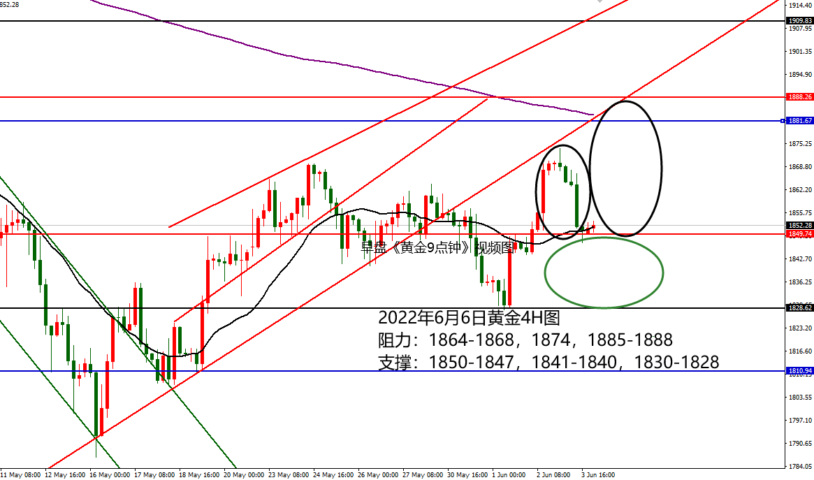 何小冰:黄金蓄势等待,1850分界上下区间 06.06 黄金白盘至今只有不到7美元的空间进行震荡, 早盘下探1850关口后向上攀升至1856.55,欧盘再度来到1850关口,上没有到达更高的阻力点,下还没跌破1850关口。 波动空间稍小,选择的主动权又是交给美盘时段,确定了方向,直接沿着方向走,对就是对,错就是错,想要调整或改变都不给机会。 这样子的情况下,无论涨跌,都得提前选择好方向,选定了等待晚间的方向选择。 黄金上周先跌两个交易日,再涨两个交易日,周五开局破高后破低,进入扫荡式收复失地,继续保持震荡节奏。 而 回踩刚好是在小非农的起涨点,四小时生命线以及箱体的分界线区域,也就是1850
