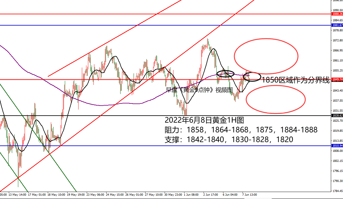 何小冰:黄金关注1842-1855,还在抉择 06.08 黄金前两个交易日走了一圈,又回到原点。 周一冲高回落,跌破1850续跌走低 周二探底回升,依托1840续涨走高 然后又回到1850关口位置,等待上下区间的抉择。 四小时形态逐次收窄区间, 中间生命线位置也与分界线位置相互临近共同成为多空主导权的分界线。 在此之上,多头掌握主导权 在此之下,空头掌握主导权 而目前正在中间的分界线位置上下三四美元的区间来回徘徊。 隔夜周二美盘依托上涨支撑点1842位置,周一美盘反弹确定阻力点1854-1855位置 ,现在各自仍是作为防守依托线的作用,共同成为接下来行情的突破切换点。 向下突破,则区间向下切
