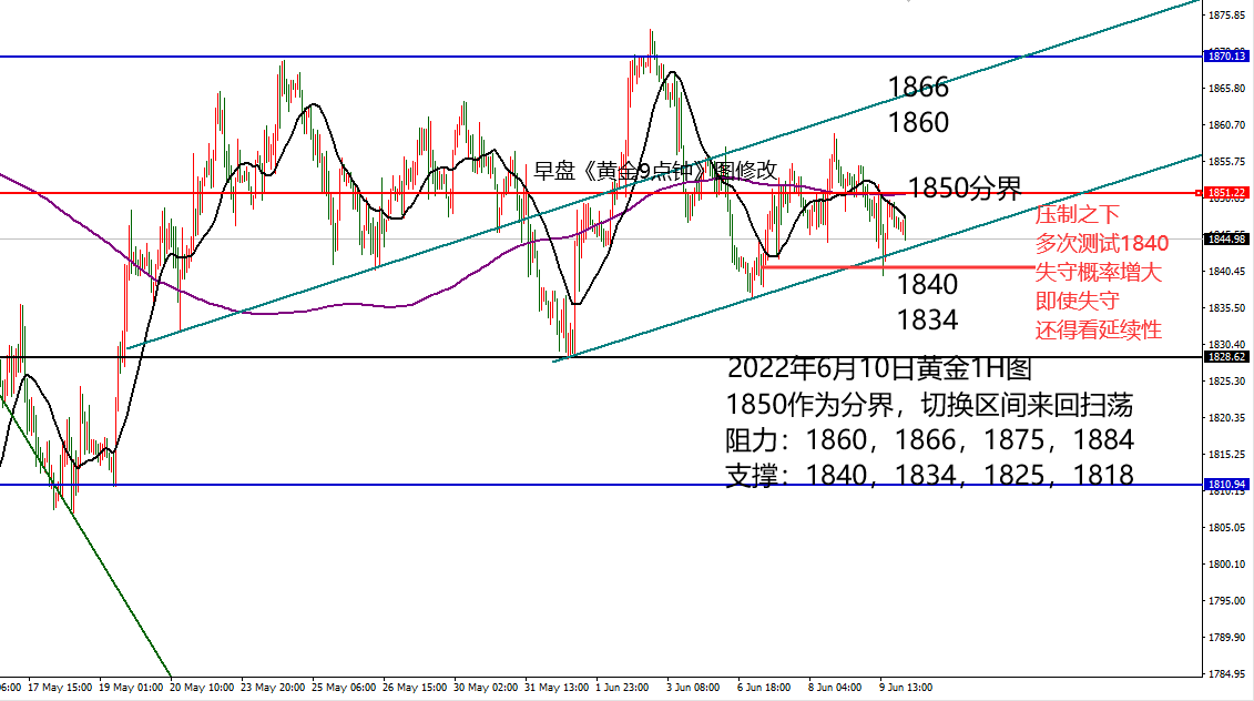何小冰:1840失守概率增大,但失守未必延续 06.10 本周的焦点在于晚间公布的美国5月消费者物价指数,即通胀CPI数据, 上一次的通胀数据未能如预期高位回落,但仍是处于高位调整,今晚的通胀数据结果,将为下周美联储货币政策利率决议提供重要的参考,上周非农数据报告稍微表现靓丽了,若通胀数据也能从高位回落,将给予美联储货币政策调整更多的灵活性。 在本周前四个交易日持续震荡收窄的情况下,若晚间通胀数据出现意外情况,届时将助力于黄金打开收窄的区间。 目前黄金继续以1850作为行情的分界线,稍微下移1848位置。 周一冲高回落,续跌走低, 周二探底回升,续涨走高, 周三探底回升,续涨走高, 周四冲高