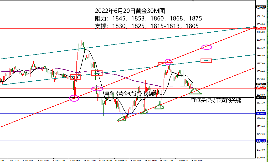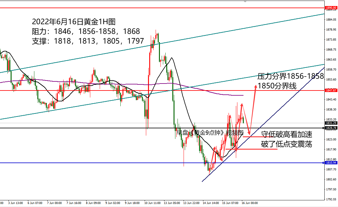 何小冰:加息落定,黄金节奏未定,守低是关键 06.16 美联储6月宣布加息75个基点尘埃落定 ,对于市场的冲击也在近几个交易日看到,整体市场走势跌宕起伏。 世界各国就像长途马拉松选手,不是跑得越快就是冠军,调整呼吸,循序渐进,把握节奏,才能走到最后。 上周五通胀CPI数据再度爆表,推动黄金大幅度上涨,经过周末两天的时间,关于美联储在本周利率决议上加息75个基点的消息被媒体频频爆出,美元指数大幅上涨,打压黄金大幅度下跌,周一直接扭转前一个交易日的上涨,转为空头向下,周二延续下跌的动作,进一步破低走低。 到了昨日周三,开局直接低位开始震荡走高攀升,然后就是这一波依托1813向上的两度攀升行情。