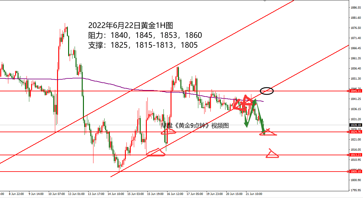 何小冰:黄金守高看节奏是阴跌延续?还是扫荡下跌06.22 黄金周一黄金价格反复确定1844-1846区域的压力,最终在美盘形成承压回落,但受到假期影响,整体行情波幅较小 周二同样是受阻压力回落,压力下移1842-1844区域,以此作为压制逐次向下走低至1830关口,美盘冲高回落下跌,破1830关口,尾盘低位横盘。 高低点的下移,同时昨日周二在欧盘失守红色通道线和四小时生命线后 ,以此作为分界,欧盘承压走低,美盘再度确定此处的阻力后再度承压走低。 分界线区域从支撑转为阻力,也将成为后续行情的分界线区域。 现在这个范围在1840-1845区域, 与上面周一周二的高点压力范围相互重合,共同成为后续