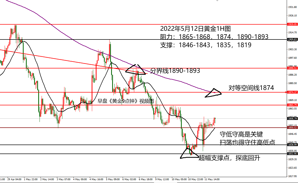 何小冰:黄金1844之上扫荡涨,1835之上宽幅扫荡 05.12 黄金早盘承压1859区域下探至1844范围,又是回踩15美元左右的幅度, 价格在触及1844区域又快速探底回升回到1850关口位置,继续将震荡进行到底。 昨日周三黄金依托1832止跌开始探底回升向上攀升走高,加速上探至1854位置,美盘时段价格短线下探至1835位置,然后又再度探底回升拉升走高,加速攀升至1858区域,尾盘高位调整修正。 这一点跟前面两天的节奏是不一样的,周一反弹确定阻力1871-1872进行下跌,破低加速下探,周二反弹确定阻力1864-1865进行下跌,破低加速下探,而周三则是回踩确定支撑1835-1836进